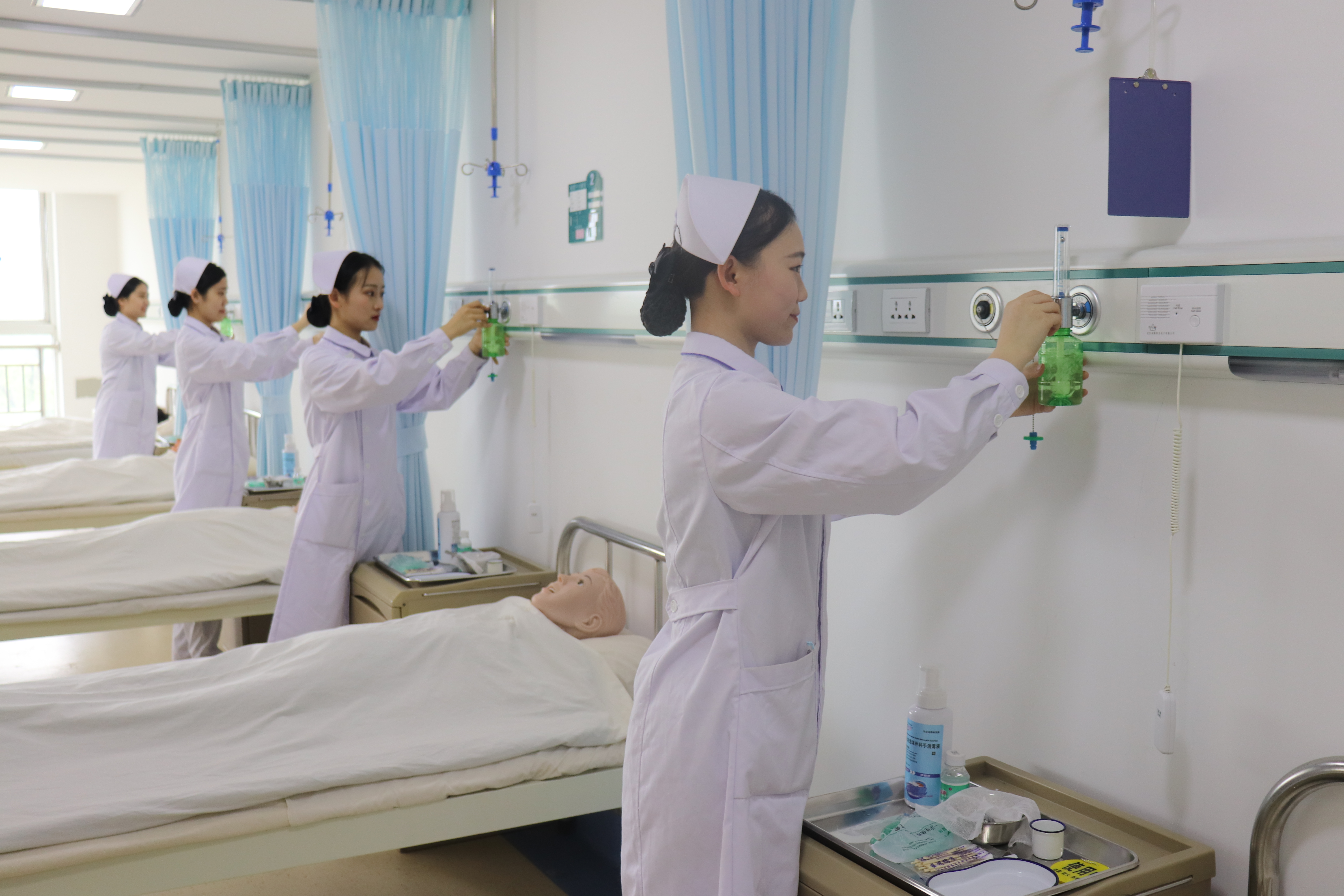 主要实训项目:皮内注射、皮下注射、肌内注射、静脉注射、雾化吸入给药法、密封式静脉输液法、静脉留置针输液法、氧气筒给氧法、中心给氧法、吸痰技术、洗胃技术、鼻饲技术、灌肠法、导尿技术、铺无菌盘法、取菌溶液法、戴脱无菌手套、隔离技术、压疮的预防护理、乙醇擦浴、口腔护理、生命体征的测量、各种铺床法等。