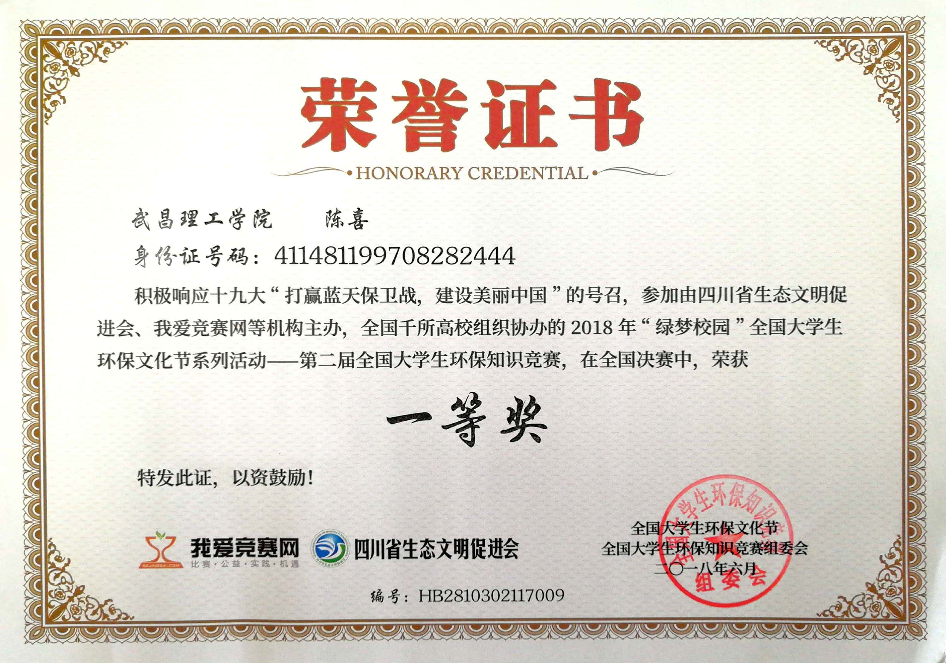 护理学1705班陈喜在第二届全国大学生环保知识竞赛中荣获一等奖
