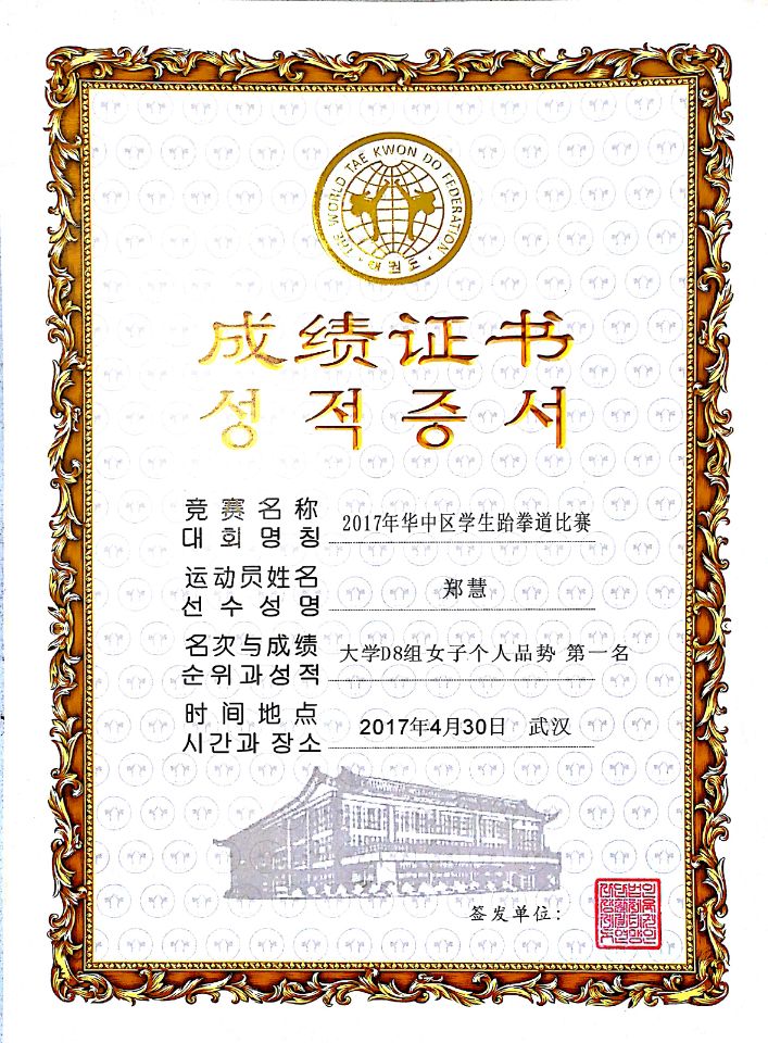 护理学1602班郑慧在2017年华中区学生跆拳道比赛中荣获个人品势第一名