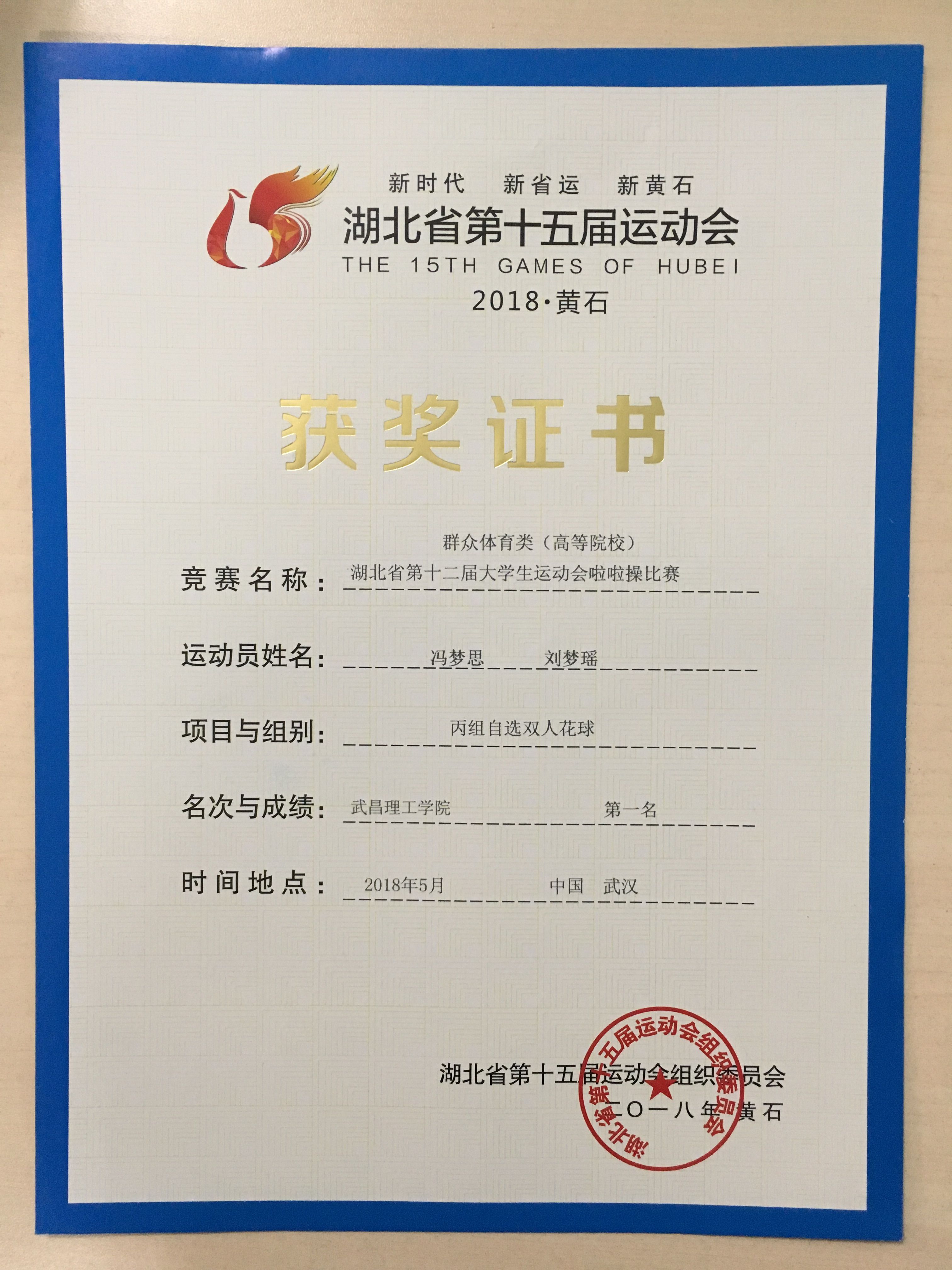 护理1608班冯梦思、刘梦瑶在湖北省啦啦操比赛中荣获第一名