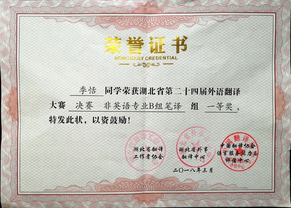 护理学1601班季恬在湖北省第二十四届外语翻译大赛决赛中荣获一等奖