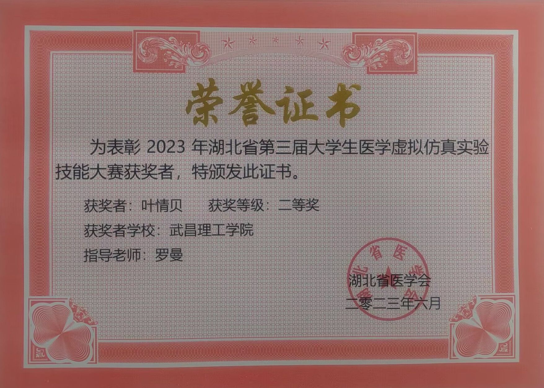 护理学2103叶情贝在2023年湖北省第三届大学生虚拟仿真实验技能大赛中获二等奖