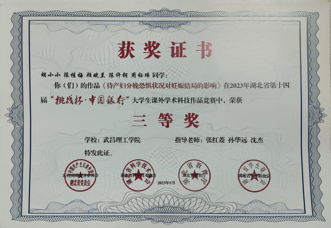护理学2101胡小小等同学在2023年湖北省第十四届挑战杯大学生课外学术科技作品竞赛中获三等奖