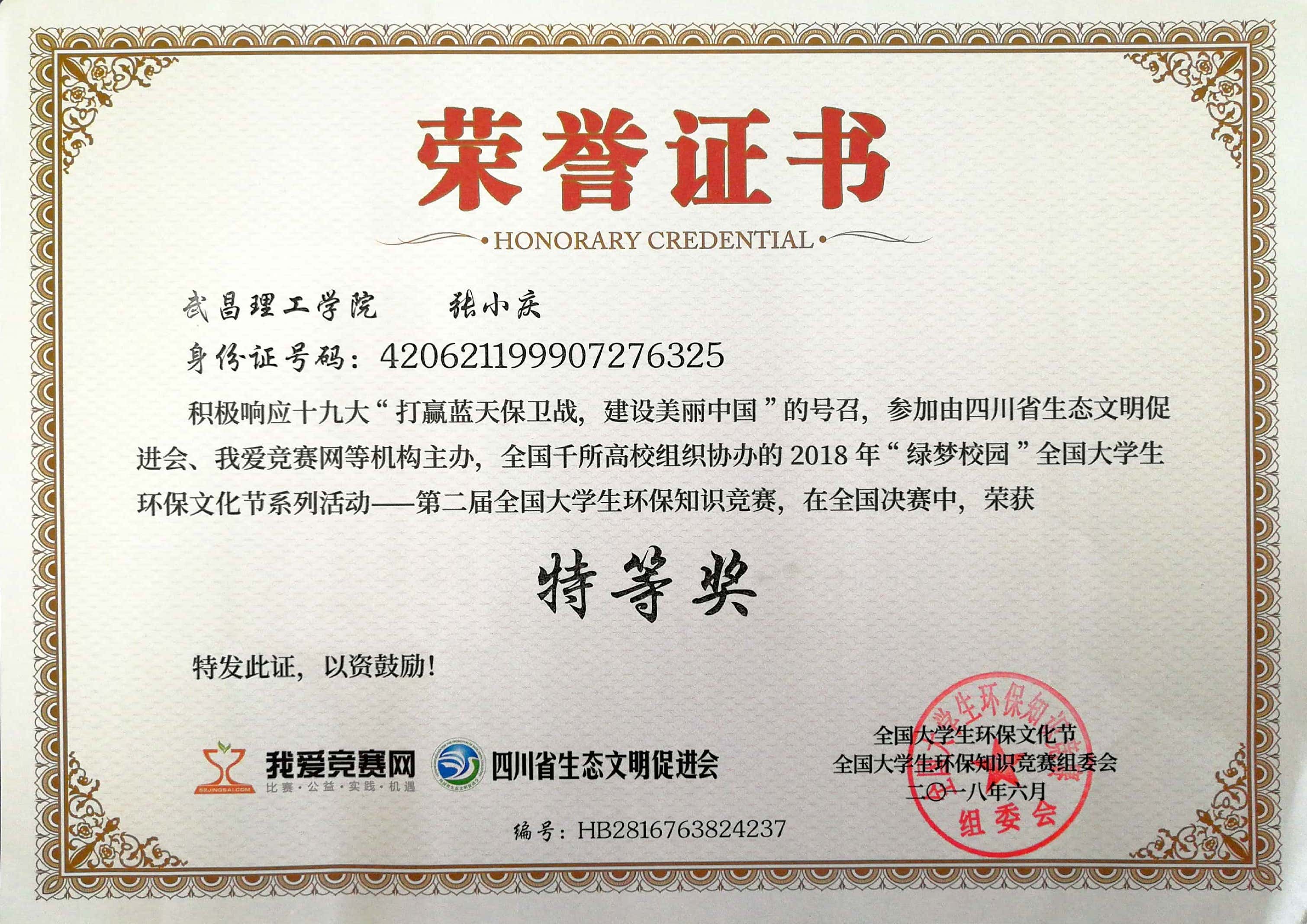 护理学1706班张小庆在第二届全国大学生环保知识竞赛中荣获特等奖