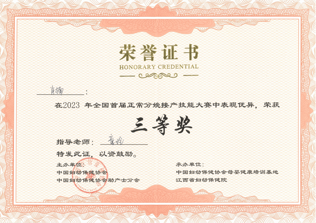 助产学2001班肖楠在2023年全国首届正常分娩接产技能大赛中获得三等奖