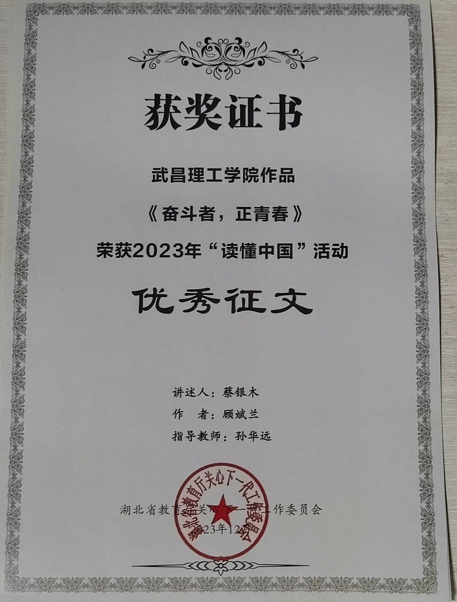 护理学2101班顾斌兰在2023年“读懂中国”活动中荣获优秀征文