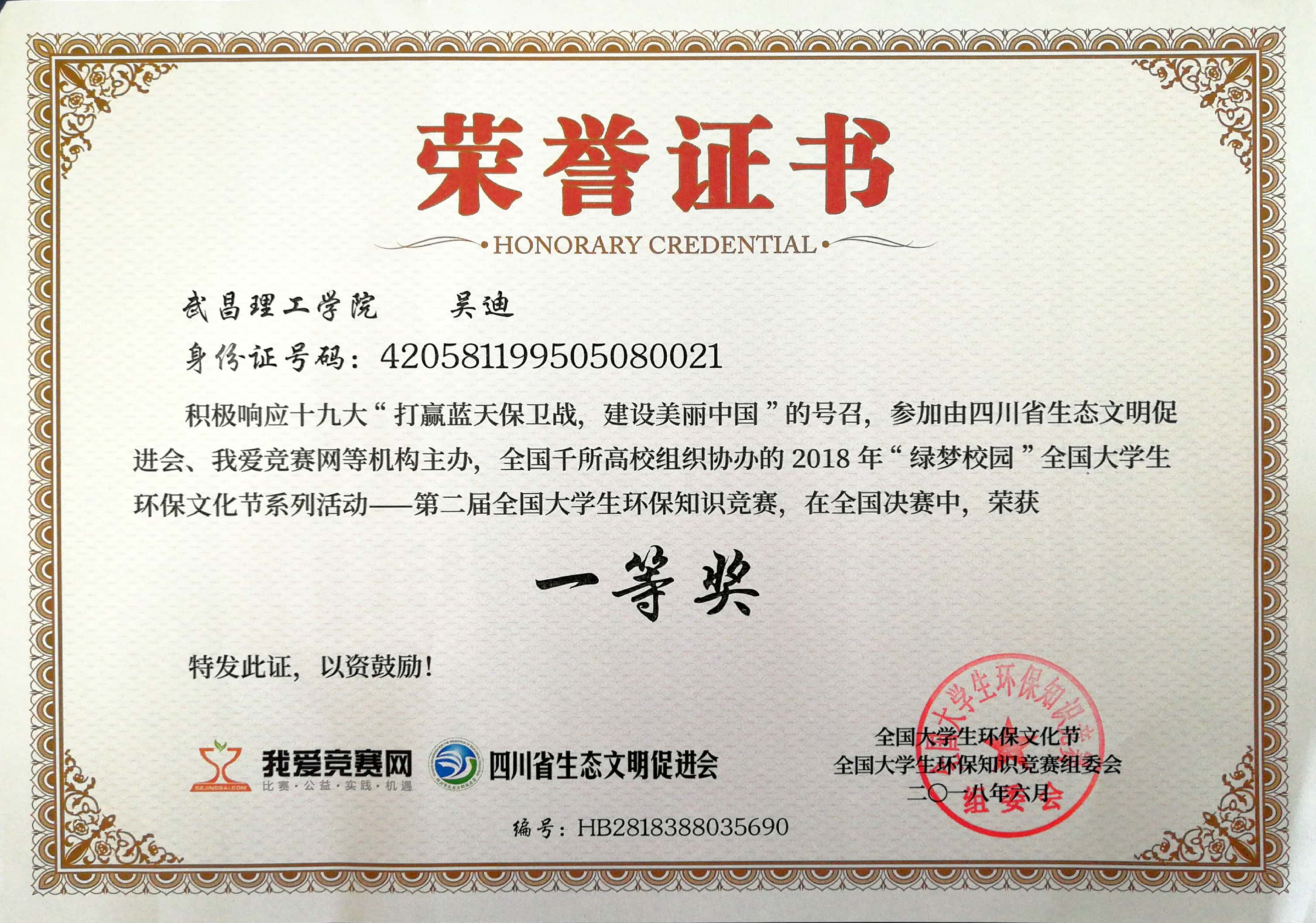 护理学1504班吴迪在第二届全国大学生环保知识竞赛中荣获一等奖