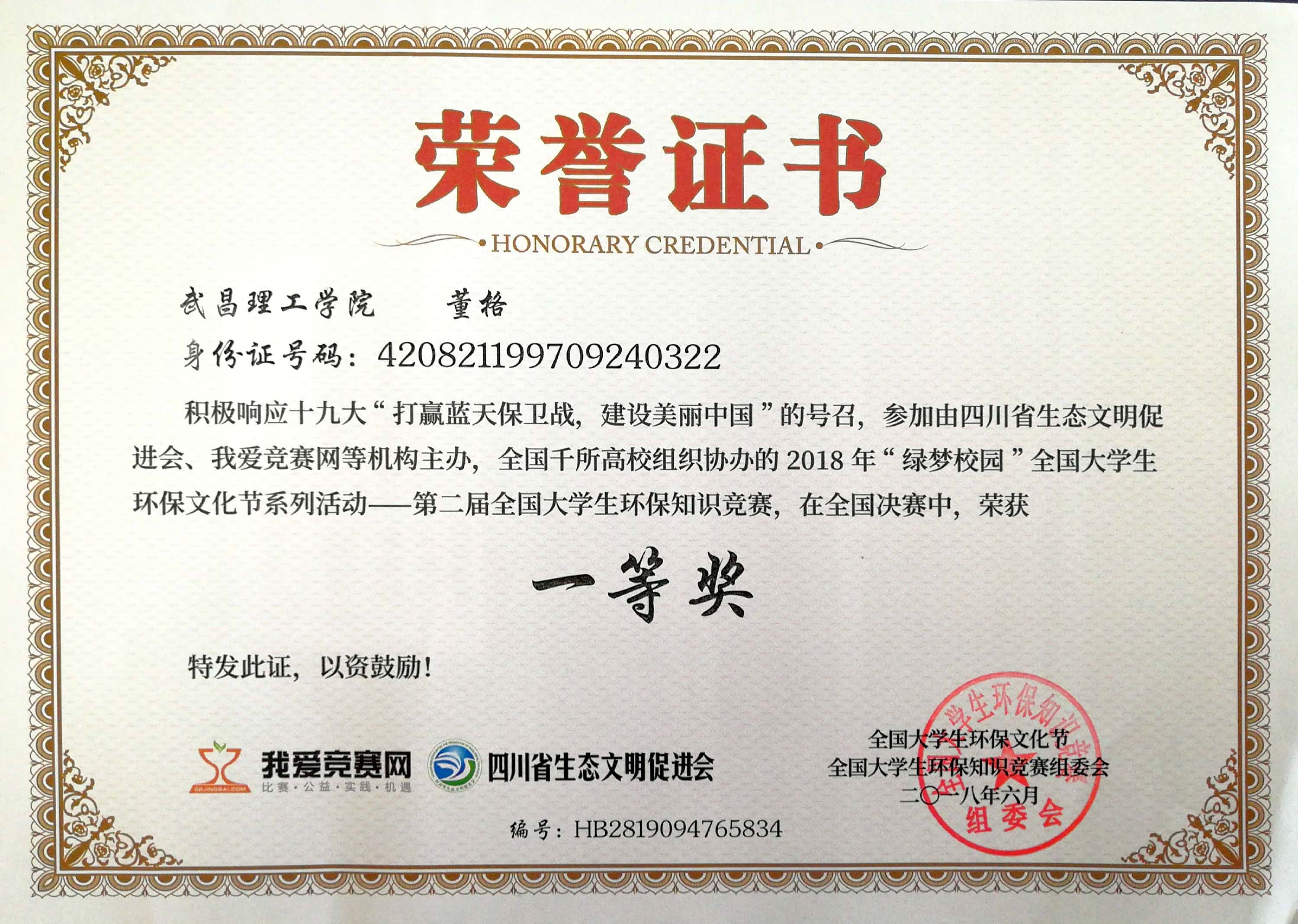 护理1608班董格在第二届全国大学生环保知识竞赛中荣获一等奖