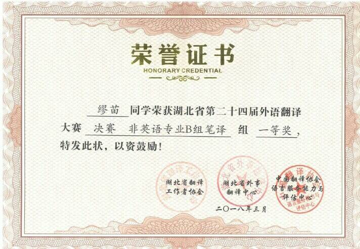 护理学1705班缪苗在湖北省第二十四届外语翻译大赛决赛中荣获一等奖