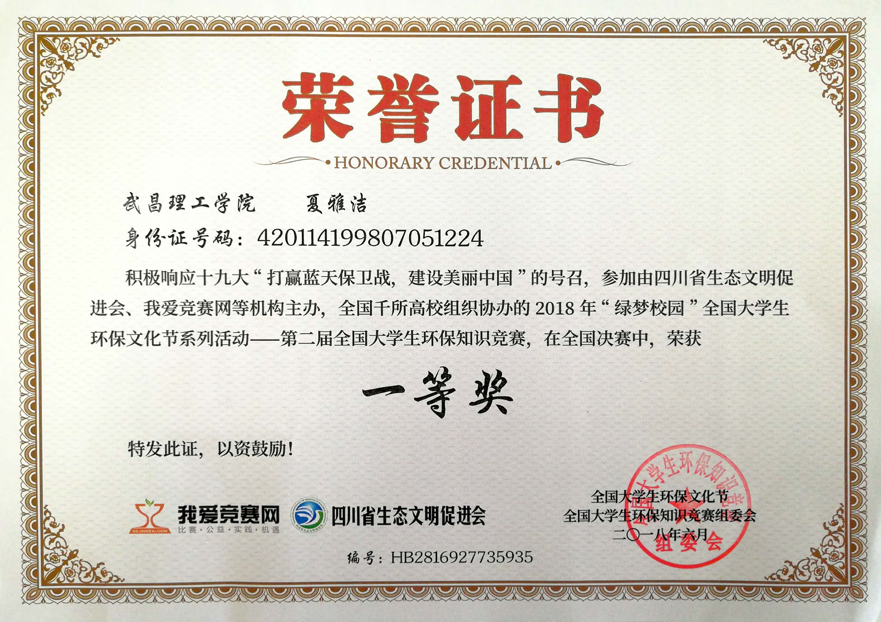 护理学1604班夏雅洁在第二届全国大学生环保知识竞赛中荣获一等奖