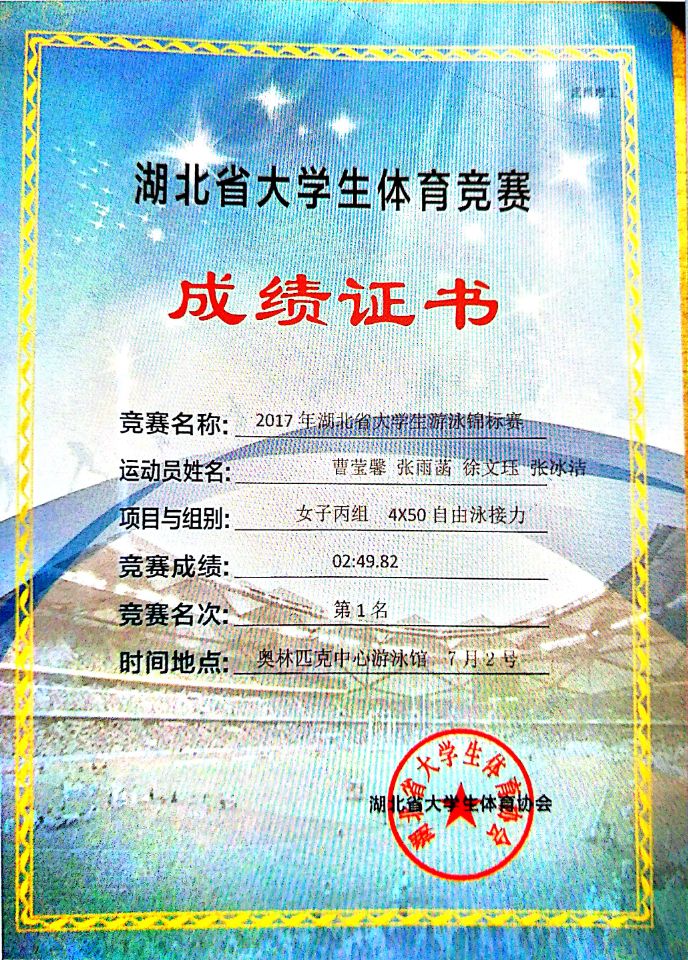 护理1603班张雨菡在2017年湖北省大学游泳锦标赛中荣获团体第一名