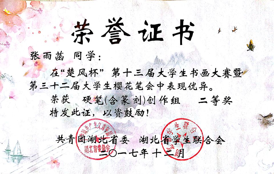 护理1603班张雨菡在“楚风杯”第十三届大学生书画大赛中荣获二等奖