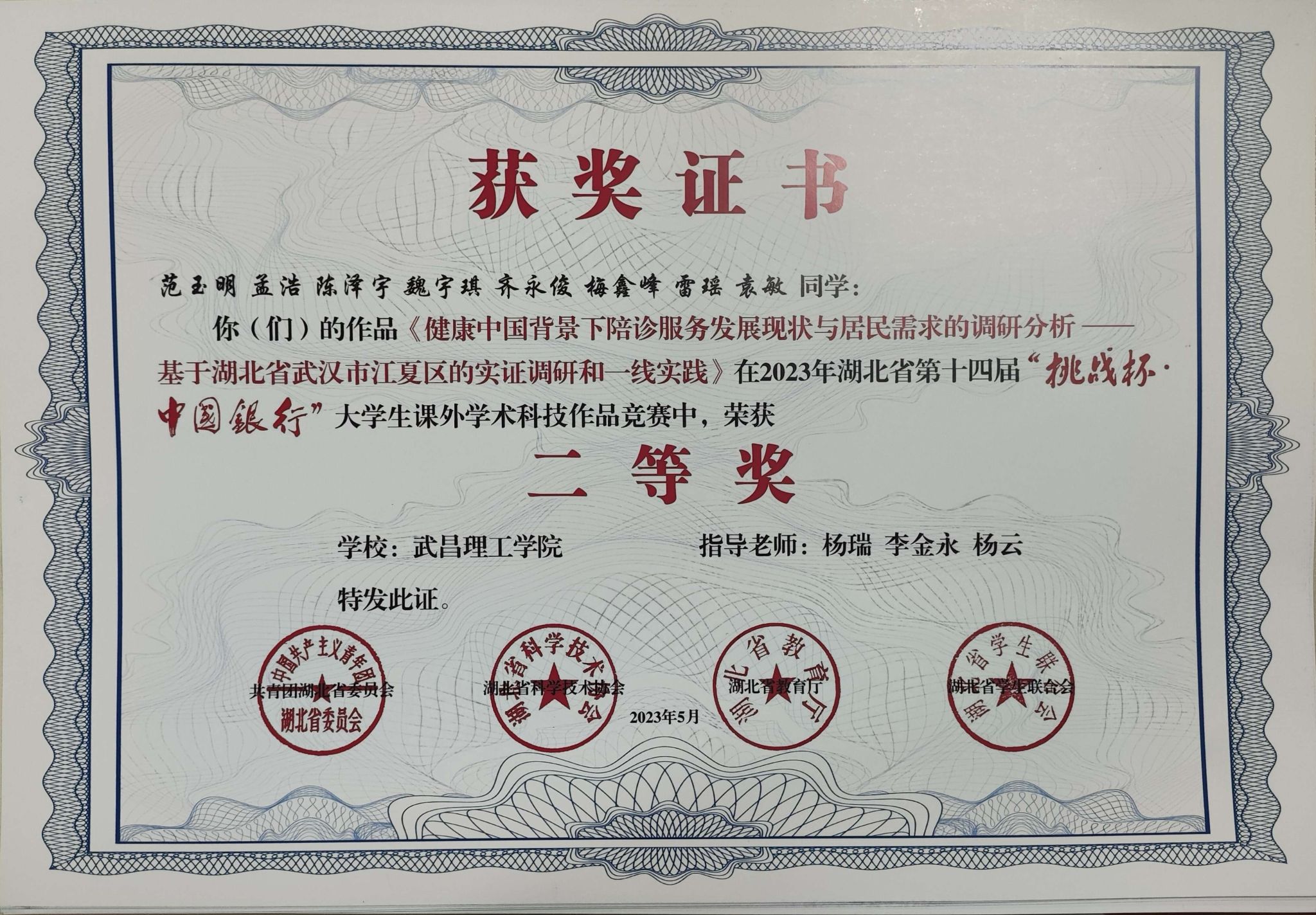 护理学2001班范玉明在2023年湖北省第十四届挑战杯大学生课外学术科技作品竞赛中获二等奖