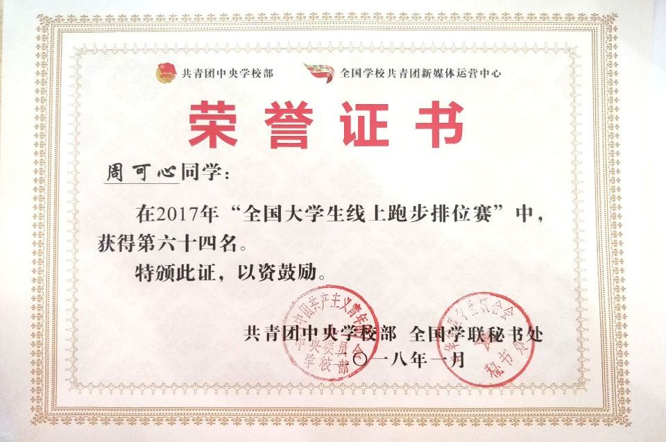 护理1706班周可心在大学生线上跑步排位赛中进入全国百强受到团中央表彰