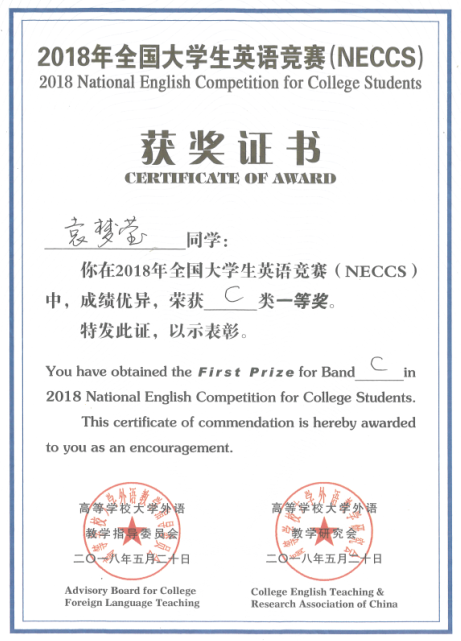 护理学1704班袁梦莹在2018年全国大学生英语竞赛中荣获一等奖
