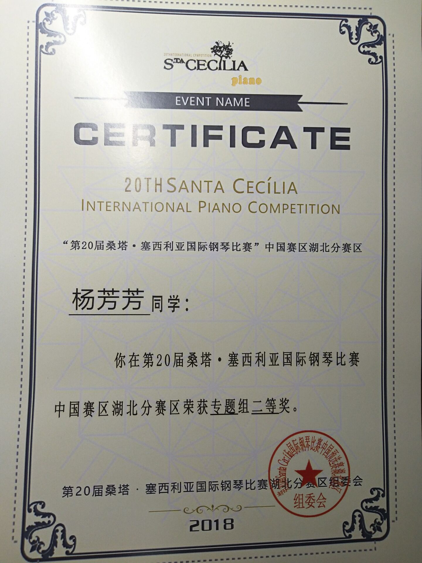护理学1501班杨芳芳在第20届桑格-塞西利亚国际钢琴比赛中荣获二等奖
