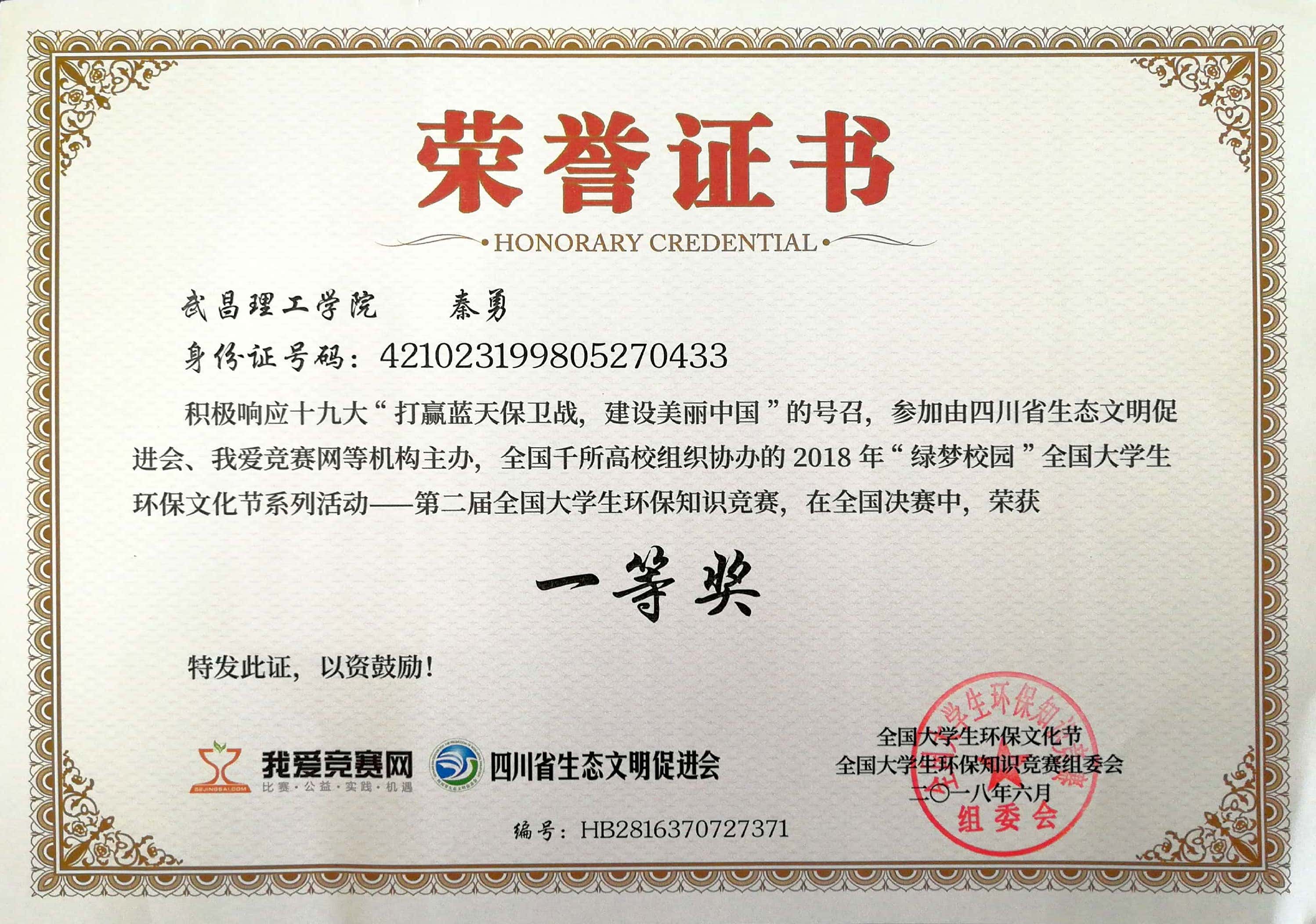 护理学1705班秦勇在第二届全国大学生环保知识竞赛中荣获一等奖