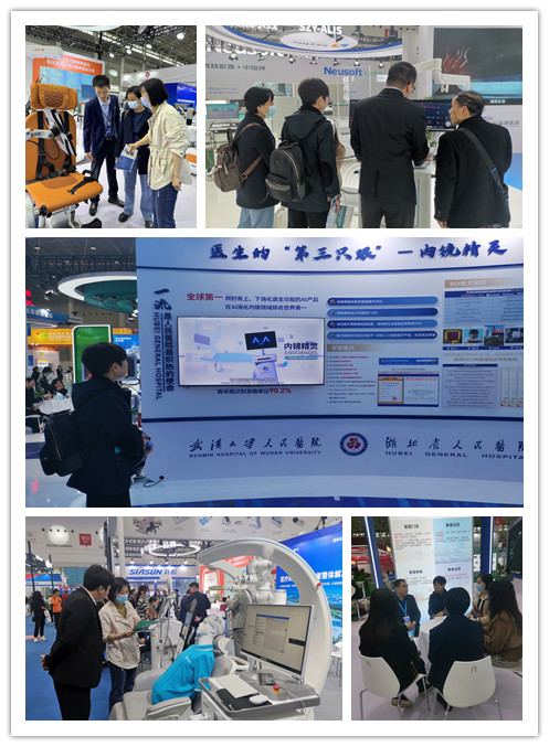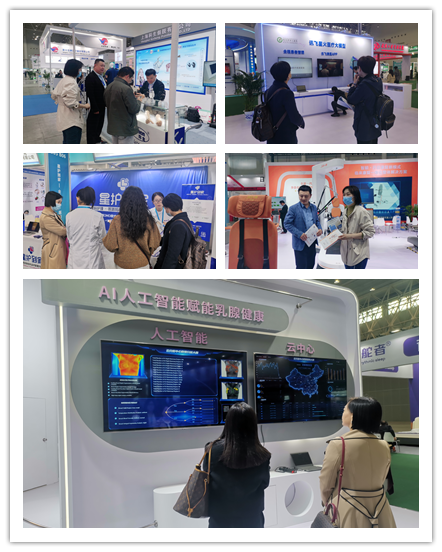 在健博会现场,学院的领导和老师们见识到了很多世界大健康领域的新产品、新技术、新成果。现场有一系列高科技医疗设备的展示,从智能诊疗机器人到高精度医学影像设备,再到远程医疗服务平台,这些创新技术不仅提升了医疗服务的效率和质量,还为患者带来了更加便捷和舒适的医疗体验。学院教师还就人工智能在医学领域的发展和人工智能融合进入医学教育方面与参展方专家进行了交流讨论。