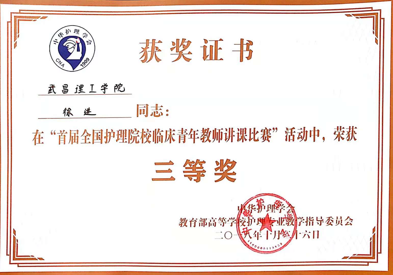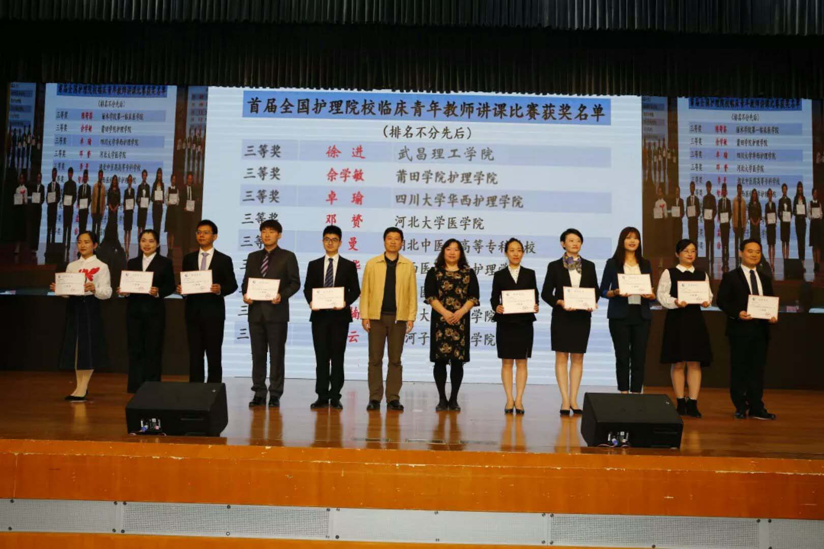 【通讯员 陈红梅 】2018年10月25日-27日,由中华护理学会、中华护理杂志社主办,教育部高等学校护理专业教育指导委员会、山东省护理学会协办的首届全国护理院校临床青年教师讲课竞赛在山东济南举行,来自北京大学、复旦大学、华中科技大学、武汉大学和2138cc太阳集团等168所院校的168名教师参加了比赛。2138cc太阳集团护理学院临床青年教师徐进荣获三等奖。