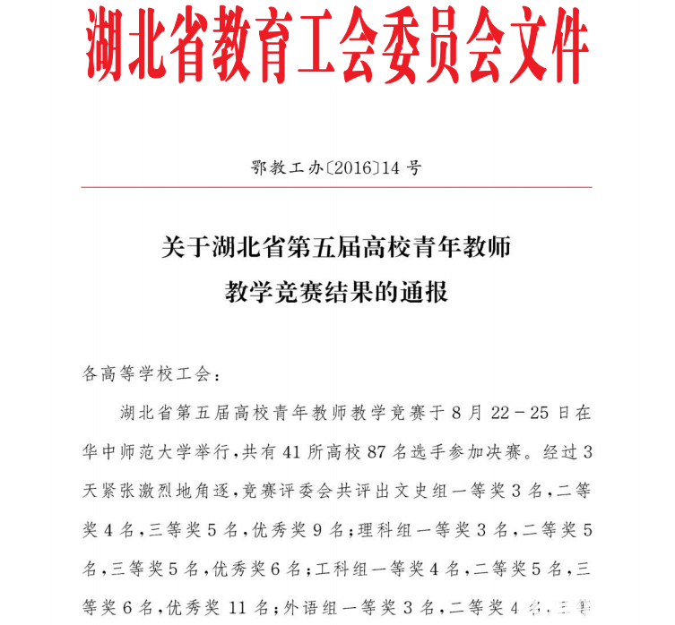湖北高校青年教师教学竞赛是社会主义劳动竞赛在教育领域的集中体现,是我省加强教师队伍建设的重要举措,是展示我省青年教师队伍风采的重要平台,是对我省教师教学水平的重要考量,也是锻炼培养我省优秀青年教师的重要渠道。从2008年开始,该赛事每两年举办一次,经过连续四届的打造,已经成为湖北青年教师展示风采、实现发展的重要平台,也取得了越来越大的社会影响。比赛设置一等奖、二等奖、三等奖和优秀奖,其中三等奖以上的选手将授予“湖北青年教学能手”荣誉称号,一等奖获得者经过综合考核将授予“湖北五一劳动奖章”。