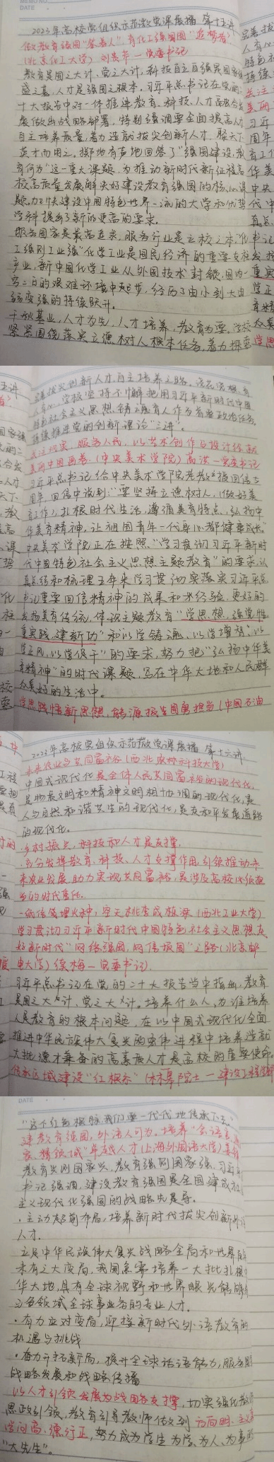 教育是国之大计、党之大计,科技自立自强是国家强盛之基,人才是强国之本。习近平总书记在党的二十大报告中对一体推进教育、科技、人才融合发展做出战略部署,特别强调要全面提高人才自主培养质量,着力造就拔尖创新人才,聚天下英才而用之。第十五讲中,北京化工大学党委书记刘贵芹指出“千秋基业,人才为先,人才培养,教育为要”,北京化工大学亦紧紧围绕落实立德树人的根本任务,着力探索完善拔尖创新人才自主培养之路;第十六讲中,习近平总书记强调,建设教育强国是全国建成社会主义现代化强国的战略先导,以人才引领发展为战略支撑,教育引导教师做到方向明、主义真、学问高、德行正。总书记寄语青年人既要有高尚品德又要有真才实学,当好社会主义建设者和接班人。微党课中提出:育人育心,各高校应坚持不懈把用习近平新时代中国特色社会主义思想铸魂育人作为首要政治任务,向“学思想,强党性,重实践,建新功”的主题教育靠拢。