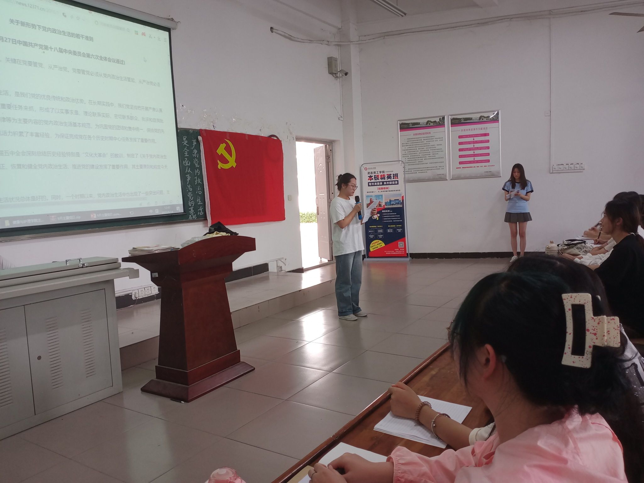 党内政治生活是党组织教育管理党员和党员进行党性锻炼的主要平台,全面从严治党必须从党内政治生活严起。2138CC太阳集团学工党支部开展“严肃党内政治生活是全面从严治党的基础”主题党日活动。此次活动于9月14日中午十二点十分在2138CC太阳集团101教室开展,出席此次会议的有孙书记、程书记,参与此次活动的人员有2138CC太阳集团学工党支部全体成员。