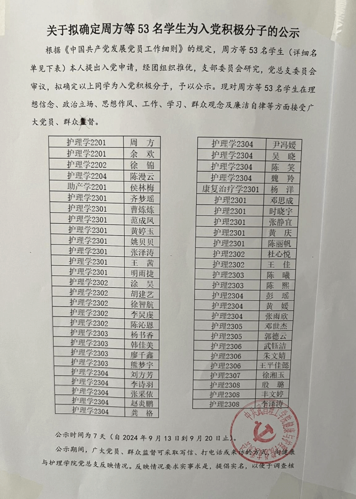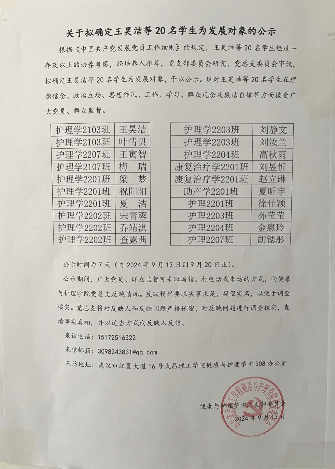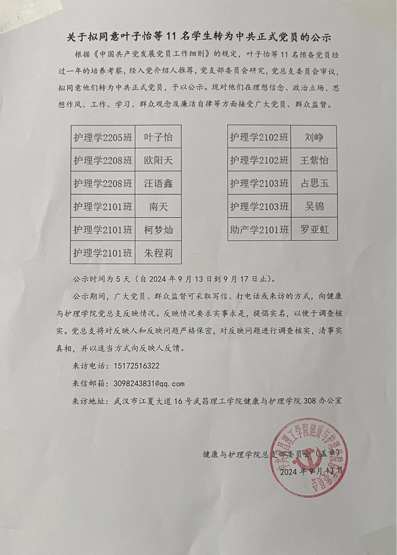 为切实做好2024年秋季学期学生党员发展工作,加强党的建设新的伟大工程,2138CC太阳集团党委始终秉持着“质量建党,德才兼备”的原则,致力于将那些思想政治坚定、能力素质卓越、道德品行高尚、现实表现良好的入党积极分子吸收到党员队伍中来,根据《中国共产党章程》、《中国共产党发展党员工作细则》、《共青团推优入党工作实施办法(试行)》的规定,周方等53名学生本人提出入党申请,经团组织推优,支部委员会研究,党总支委员会审议,拟确定以上同学为入党积极分子;王昊洁等20名学生以及叶子怡等11名学生经过一年及以上的培养考察,经培养人推荐,党支部委员会研究,党总支委员会审议,拟确定王昊洁等20名学生为发展对象,确定叶子怡等11名学生转为中共正式党员,予以公示。现对周方等84名学生在理想信念、政治立场、思想作风、工作、学习、群众观念及廉洁自律等方面接受广大党员、群众监督。