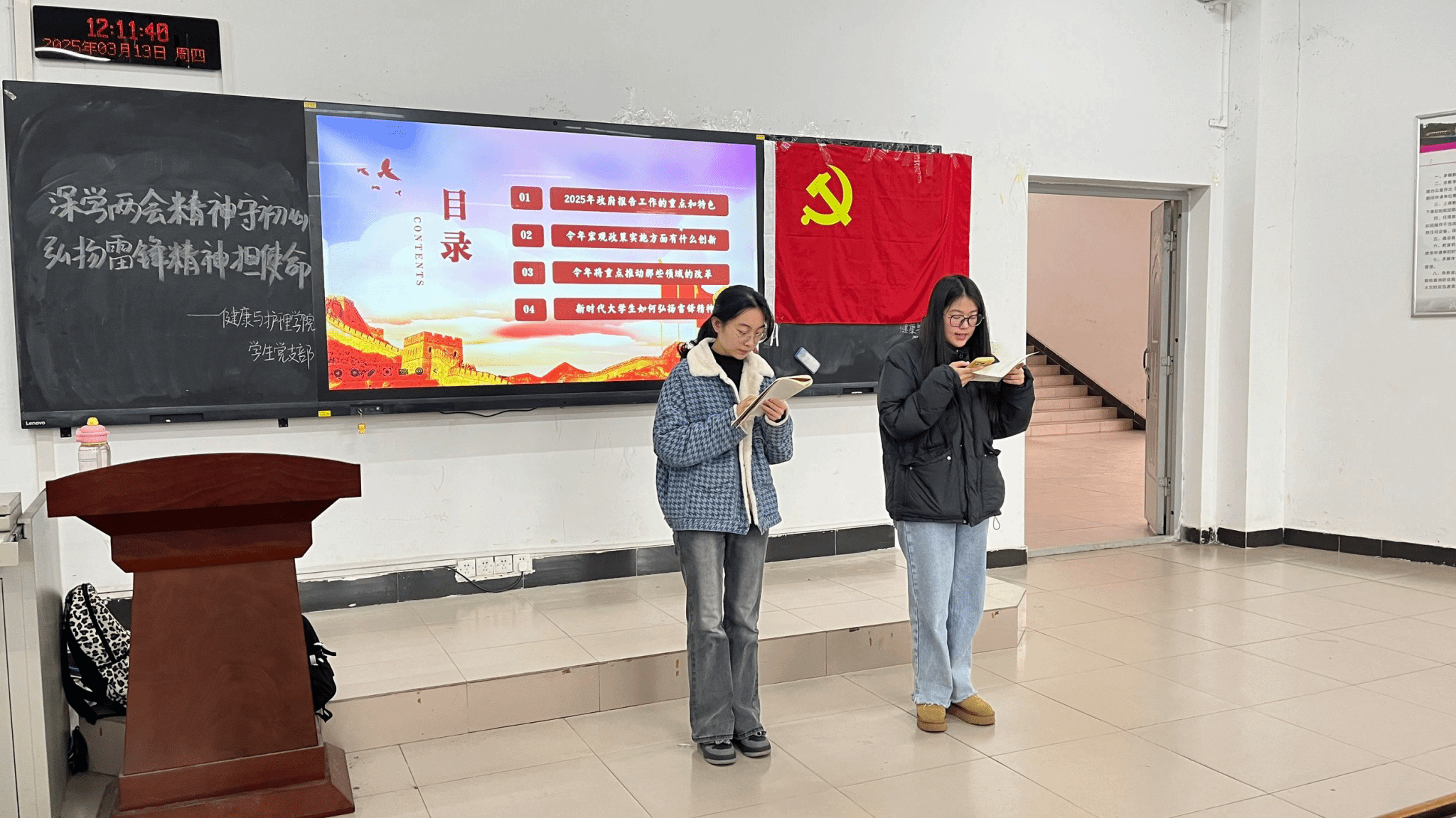 活动开始,康复治疗学2201班吴彤宇和黄蒲敏同志,担当起领学重任。她们细致剖析了两会中医疗、教育领域的关键政策。在医疗方面,针对深化医疗体制改革、提升基层医疗服务能力等政策展开解读,强调这与同学们未来的职业方向紧密相连,鼓励大家关注政策导向,为改善医疗服务现状贡献力量。在教育领域,她们就两会中关于高等教育质量提升、专业人才培养的政策,鼓励同学们在专业学习中紧跟教育政策步伐,不断提升专业素养,将两会精神融入职业理想,坚守为人民健康服务的初心。