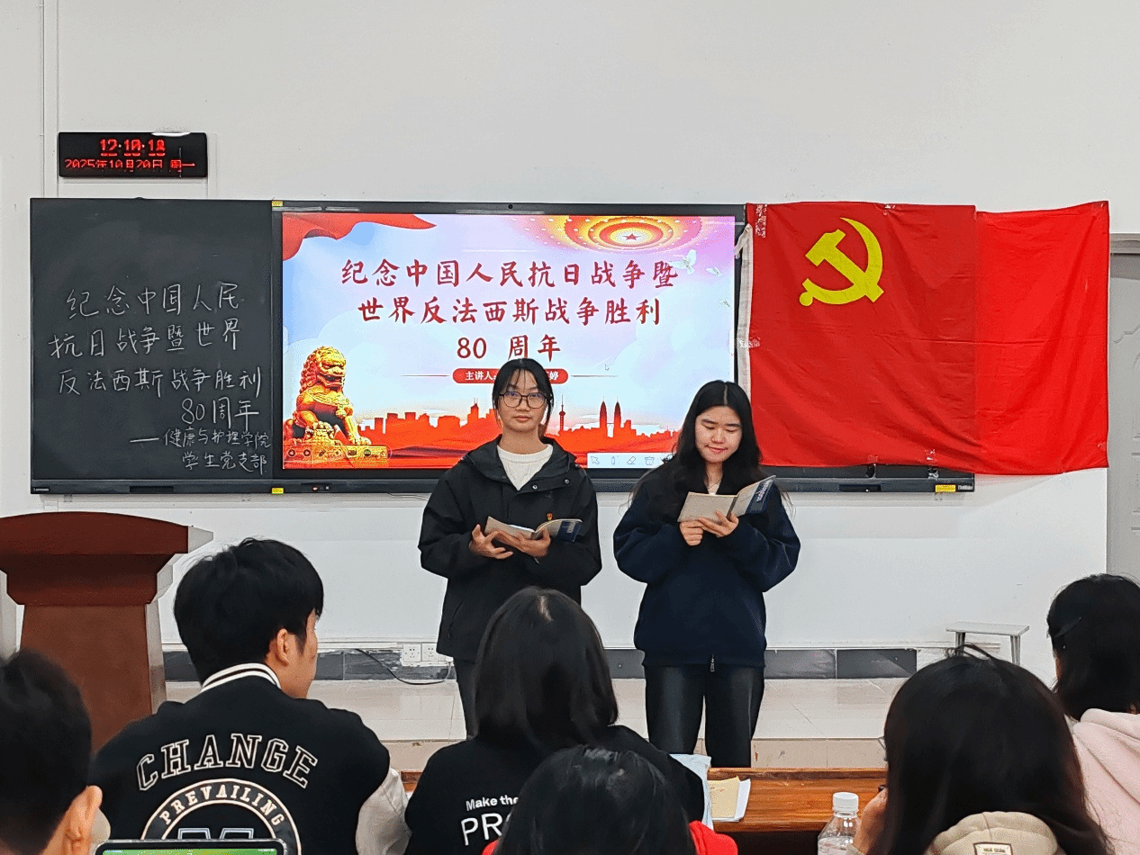 此次活动由护理学2302班丁婷同志和康复治疗学2301班徐冰冰同志担任主讲人。活动伊始,主讲人带领大家回顾中国人民抗日战争暨世界反法西斯战争的关键历史脉络,强调抗战历史是中华民族的宝贵精神财富,引导支部成员学习铭记抗战历史对激发使命担当的重要性。