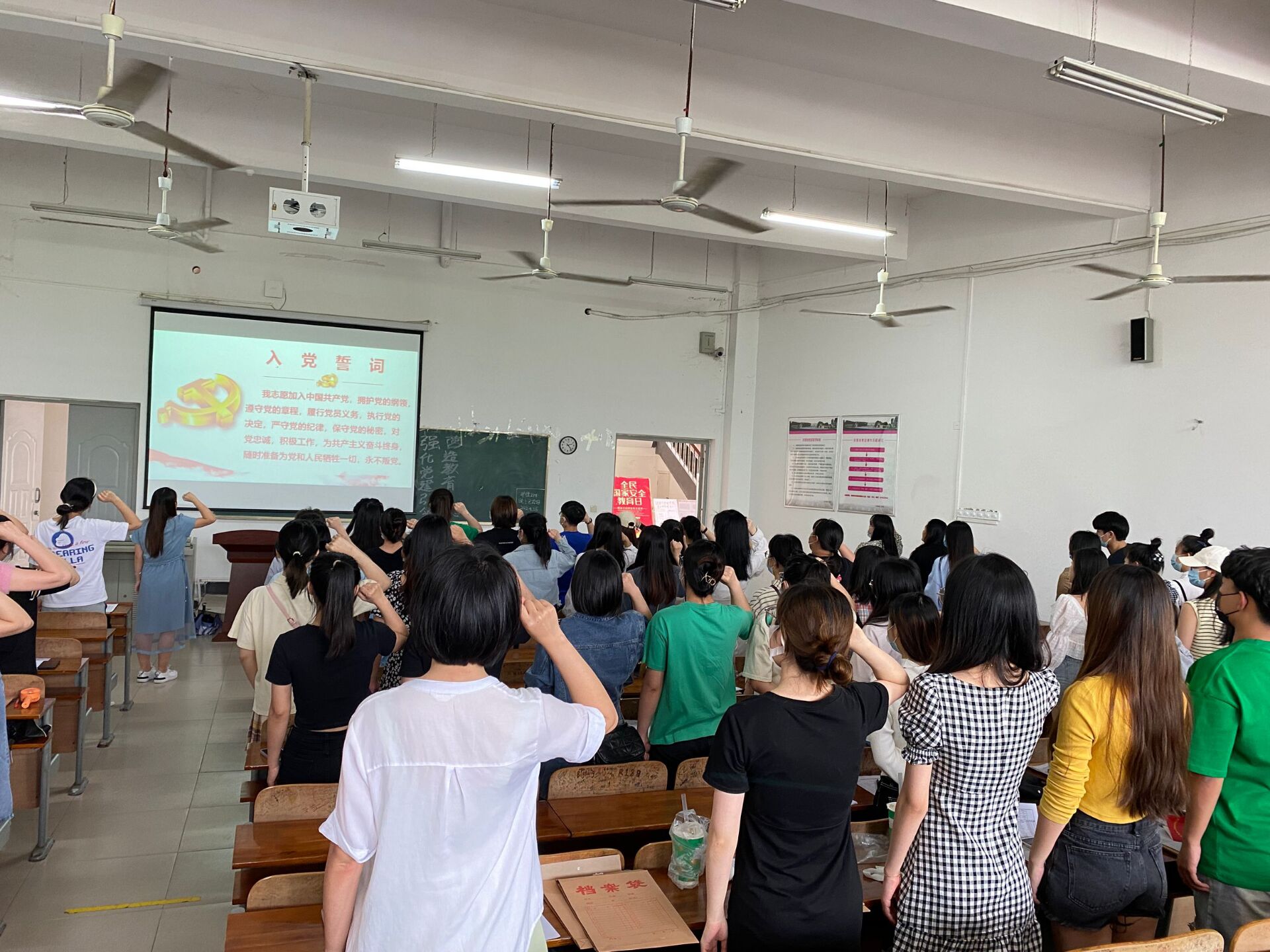随后,在2138CC太阳集团学工党支部书记韩凤鸣的带领下,所有毕业生党员面向党旗,举起右拳,重温入党誓词。
