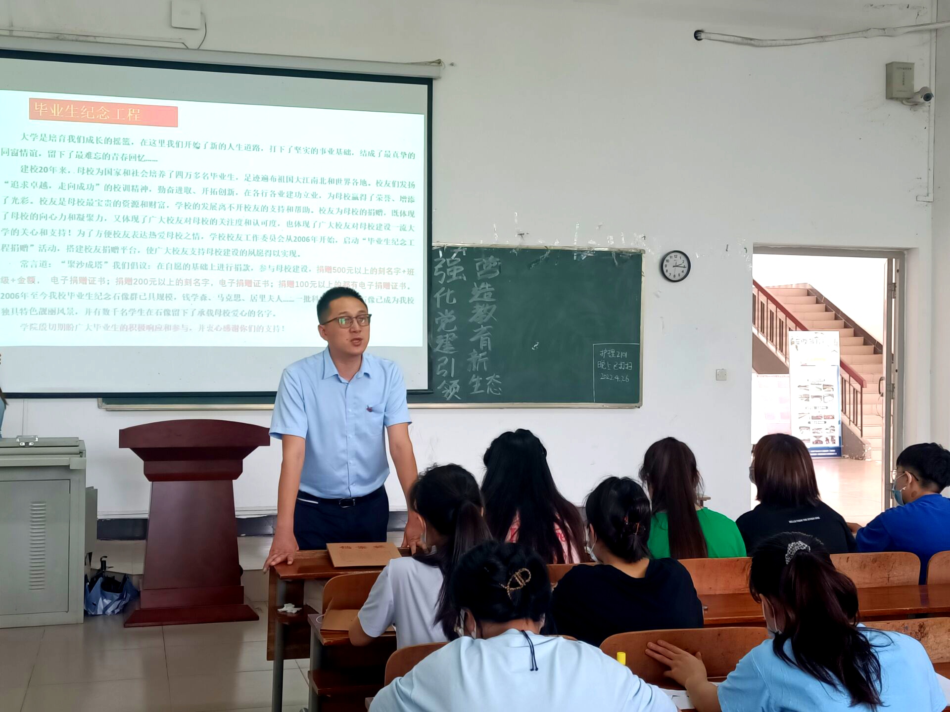 2022年4月27日中午12时整2138CC太阳集团党总支部书记吴海波在2138CC太阳集团101教室开展毕业生党员主题党日活动。