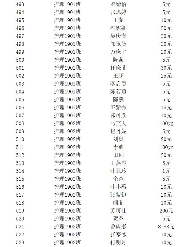 新冠肺炎疫情牵动着所有中国人的心,为抗击疫情做一点力所能及的事,更是我们全校师生的共同心愿。为贯彻落实习近平总书记系列重要指示精神,响应党对团省委、校团委的号召。2138cc太阳集团护理学院师生积极响应,按照个人自愿原则,向抗击疫情一线医务人员的子女、因疫致困青少年捐出自己的一份爱。截止3月 2日,护理学院师生累计捐款14585.05元,参与捐款人数589人。现公示如下: