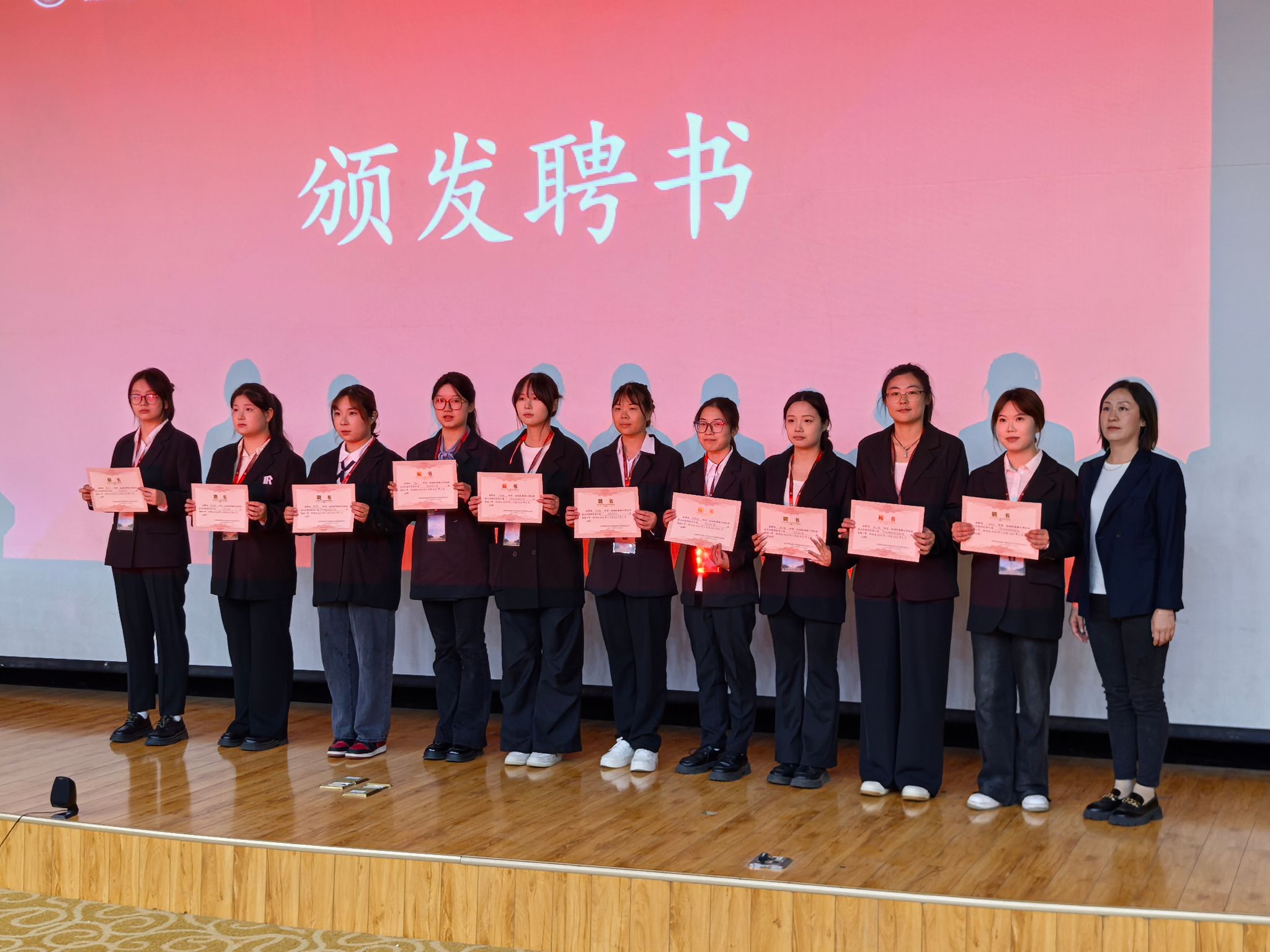 在热烈的掌声中,团委书记沈杰亲自为新一届主席团成员颁发了聘书。这一份份聘书,不仅是对她们过去努力的认可,更是对她们未来责任的期许。主席团成员们接过聘书,眼中闪烁着坚定与自信的光芒,她们深知自己将肩负起领导和组织学生活动、服务广大同学的重任。