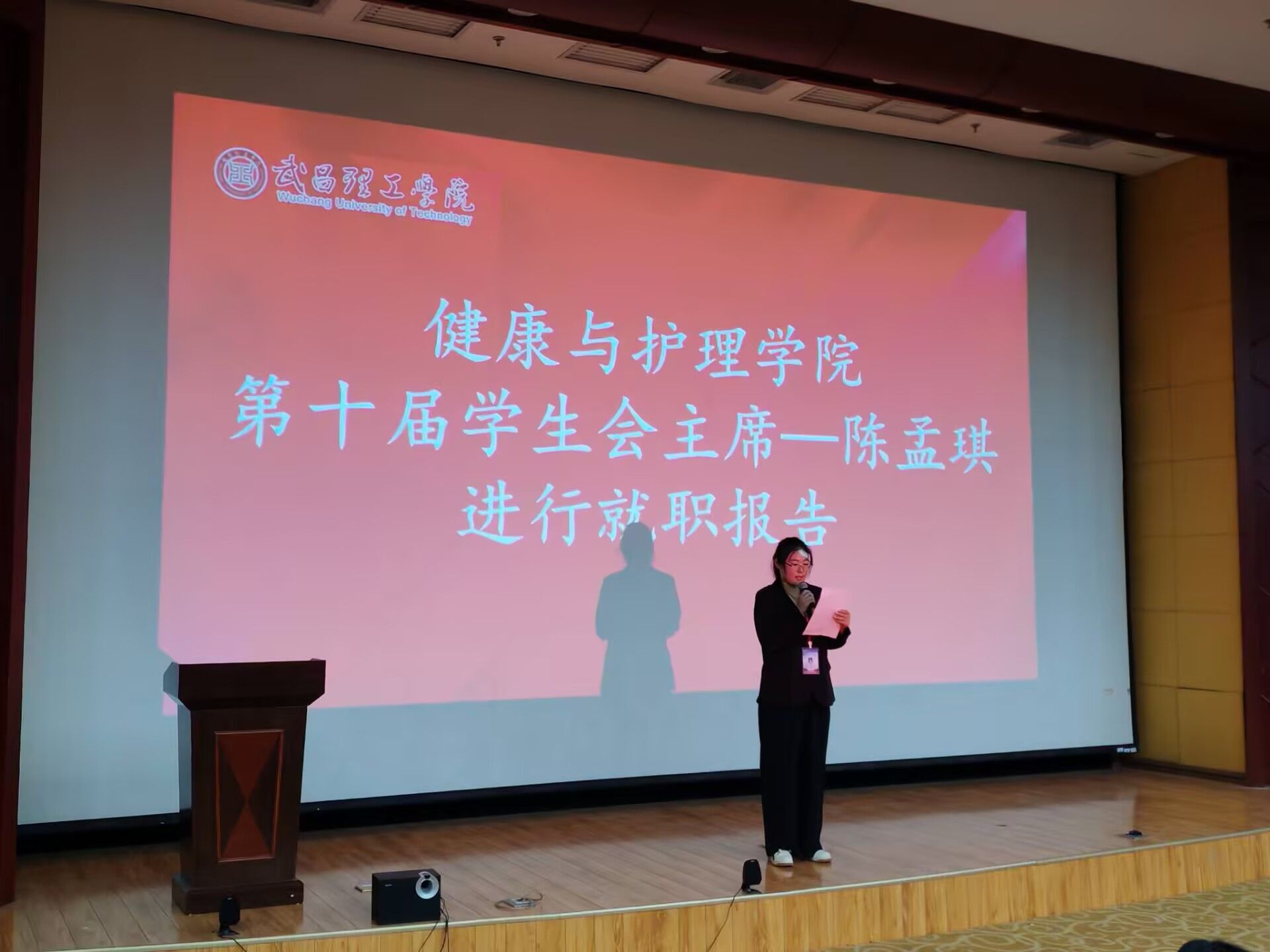 接着,学生会主席陈孟琪进行了就职报告。她全面回顾了过去一年学生会在思想引领、学术创新、文体活动、志愿服务等多个领域所取得的显著成就,同时也坦诚地指出了工作中存在的不足,并对未来的工作提出了富有建设性的建议和展望。陈孟琪的就职报告,不仅是对过去工作的总结,更是对未来工作的规划和展望。