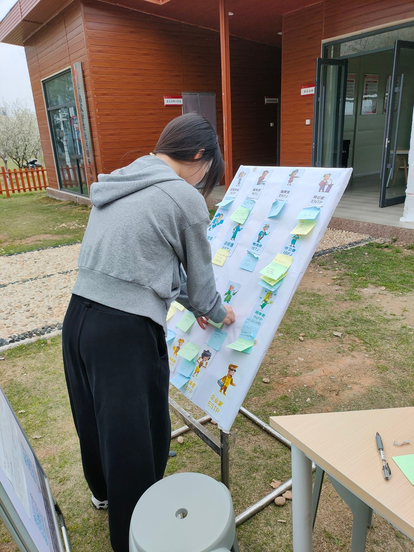活动过程中,在社团负责人和团学干部们的精心布置积极引导下,吸引了许多感兴趣的同学们参与,现场活动气氛热烈。此次活动的主要流程为参与者们通过扫描二维码进行答题后现场测试出自己的人格类型,接着在工作人员的引导下写下自己社交信息或最近的小烦恼、小疑问,同时还可以选择其他同学写在便利贴的问题进行回答。通过此活动,同学们不仅有机会结识志同道合的朋友,还能收获到来自陌生人的建议与鼓励,解决内心的困惑。这样的良性互动增进了彼此之间的了解,让同学们更好地关爱自己和他人。活动结束后,每位参与者都收获了一份小礼物一颗棒棒糖,这不仅是一份奖励,更是对他们积极参与的认可。