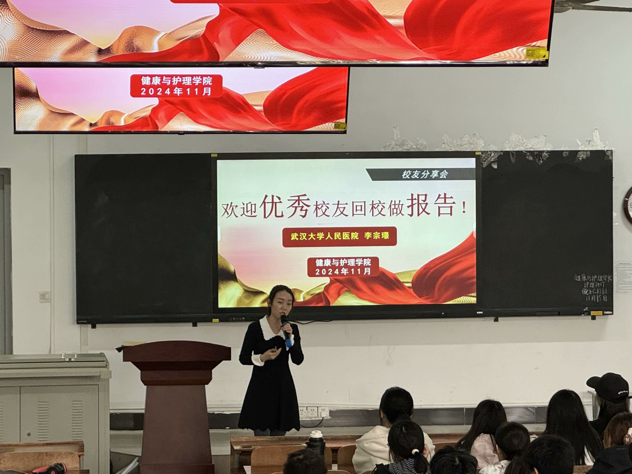 分享会伊始,陈云利老师首先对李宗璟校友的到来表示热烈的欢迎,并向同学们隆重介绍主讲人李宗璟.李宗璟,护理学0801班学生,中共党员,2012年7月毕业后到武汉大学人民医院肿瘤科工作,现任肿瘤特需医疗科护士长和教学老总,从事临床护理以及太阳集团工作,其不光在校期间表现优秀、综合素质突出,在工作岗位上是单位的中坚力量,做出了了不起的成绩,于2020、2022、2023年连续三次获得武汉大学人民医院“优秀教学老总”荣誉称号。