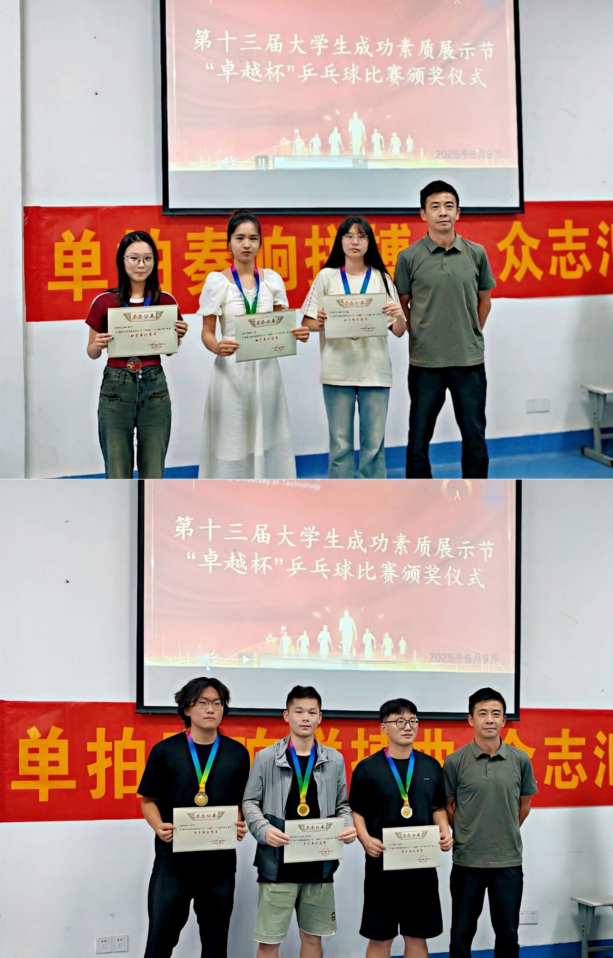颁奖仪式在热烈的氛围中拉开帷幕。首先颁发的是男子单打奖项,康复治疗学2201班的范晋嘉凭借精湛球技和顽强斗志摘得桂冠;软工2301班的王杨洋以灵活战术斩获亚军;影制2301班的王晨良发挥稳健,荣获季军。张和峰老师为三位获奖选手颁发奖杯、证书并合影留念,现场掌声不断。