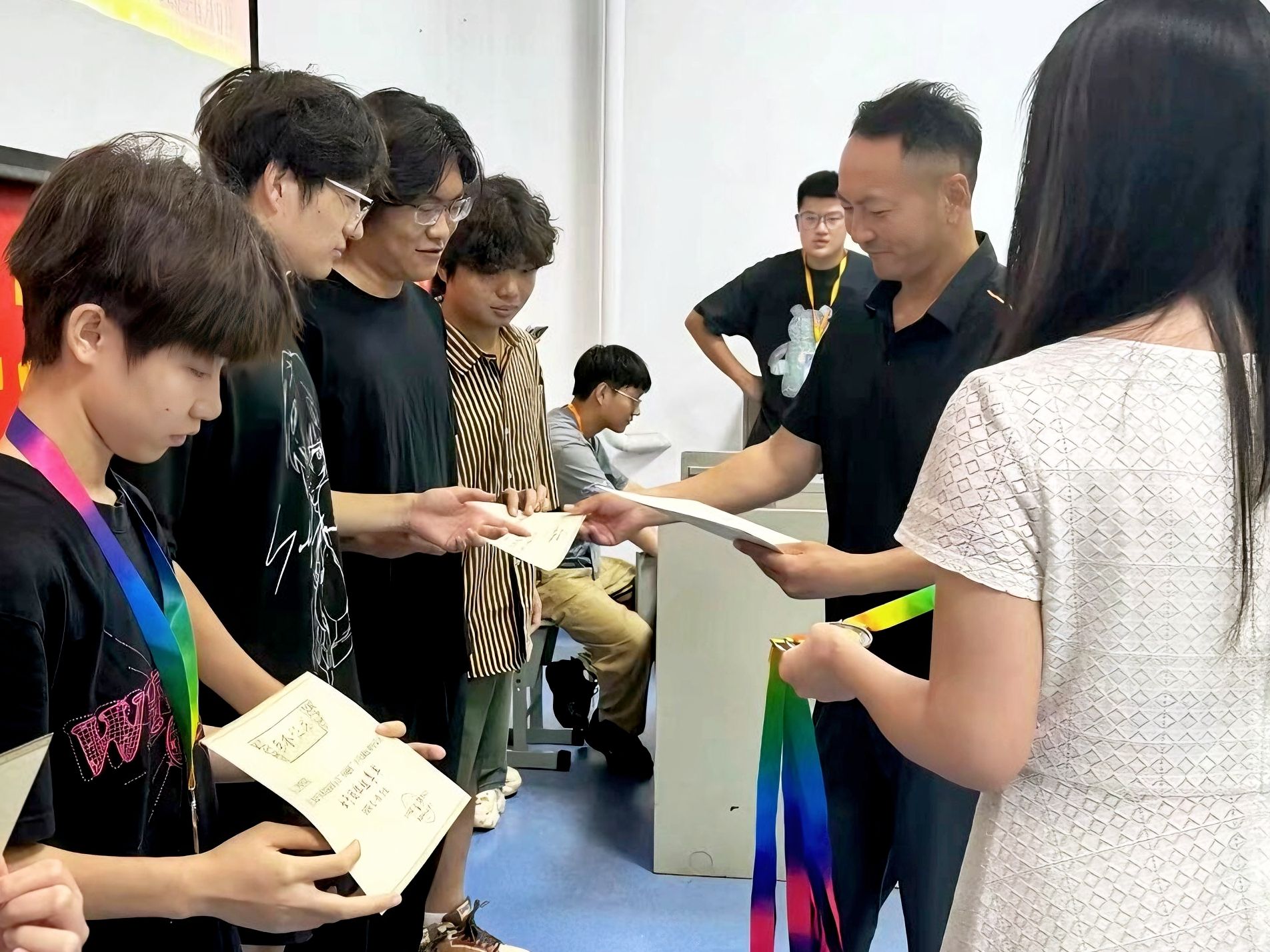 最激动人心的团体赛颁奖将仪式推向高潮。王德平主任宣读获奖名单并为团队颁奖,肯定了各参赛队伍在比赛中展现出的团结协作精神。最终,2138CC太阳集团夺得女子组团体冠军,人工智能学院摘得男子组桂冠;文法学院女子组、2138CC太阳集团男子组荣获团体赛亚军;女子组第三名由人工智能学院获得,男子组第三名归属创意设计学院与影视传媒学院联队。领奖台上,队员们高举奖杯,笑容灿烂,现场气氛热烈。