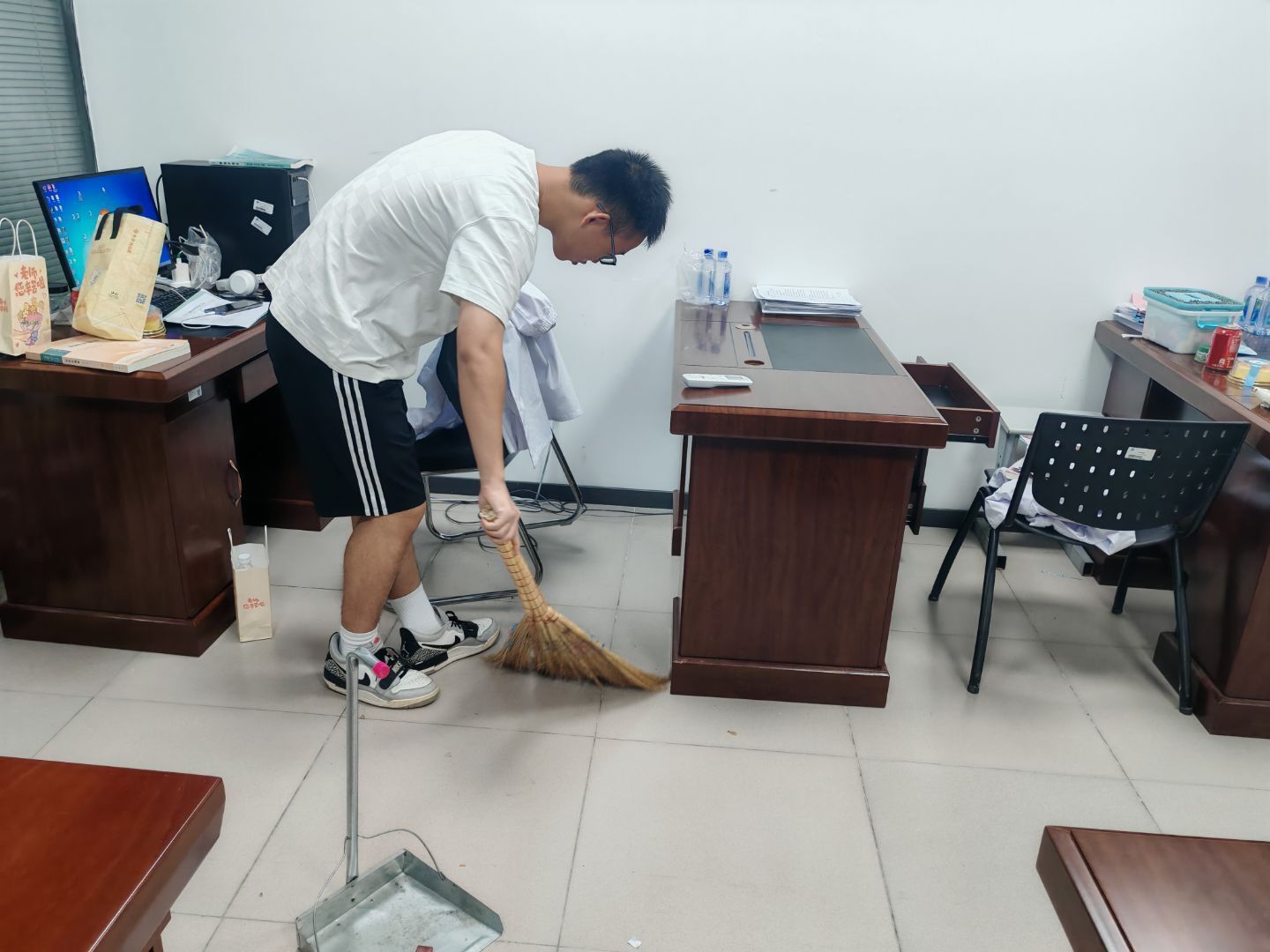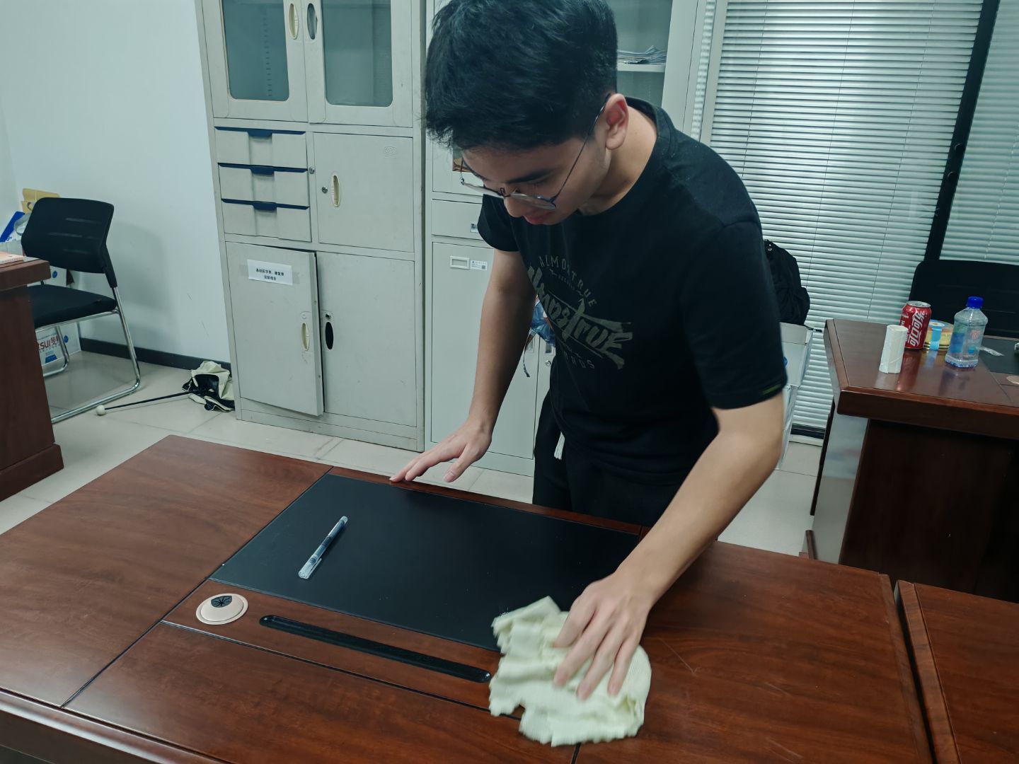 抵达办公区域后,志愿者们迅速明确分工,默契投入清扫工作。部分志愿者踮起脚尖,双手紧握抹布擦拭窗户玻璃,从窗框边缘到玻璃角落逐一清理积尘,让阳光更通透地洒进办公室。还有志愿者弯腰整理办公桌上的文件资料,按教学资料、科研文档、日常表单等类别分类后,对齐摆进文件架,让桌面变得规整。另有志愿者手持提前配比好的消毒液,对门把手、键盘、鼠标等高频接触部位先喷洒再擦拭,确保消杀到位。