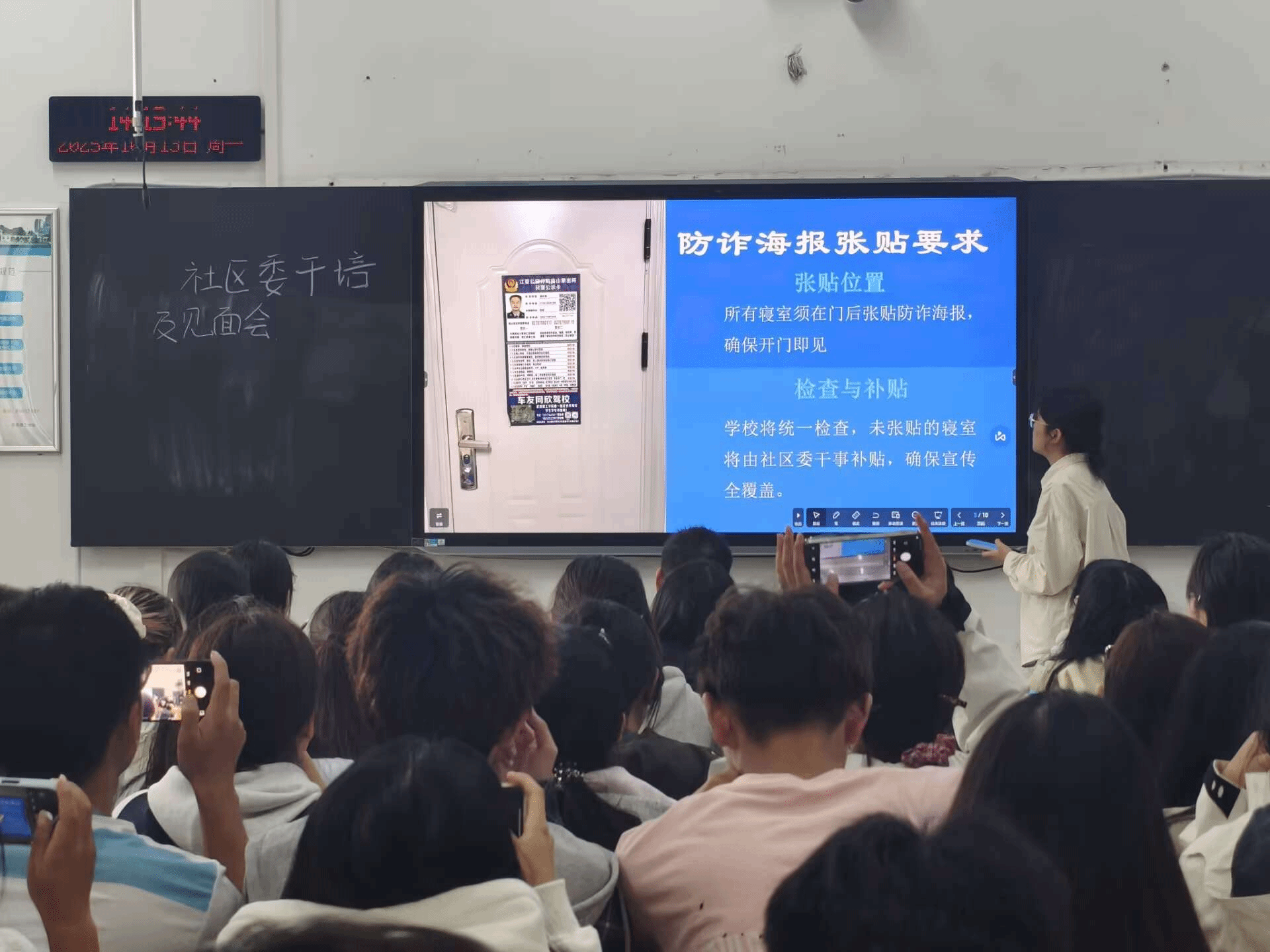 专项工作流程讲解环节,针对寝室管理、日常值班等关键工作进行重点指导。寝室红白榜制作强调信息准确匹配与规范排版,需严格遵循既定顺序与格式要求;楼栋晚归查寝工作明确了时间节点、登记流程及特殊情况处理方式,确保工作开展有据可依;早餐值班工作则细化了值班人员的职责与行为规范,要求干部以身作则,维护校园良好秩序。各项流程的清晰解读,为干部们后续开展工作提供了明确指引。