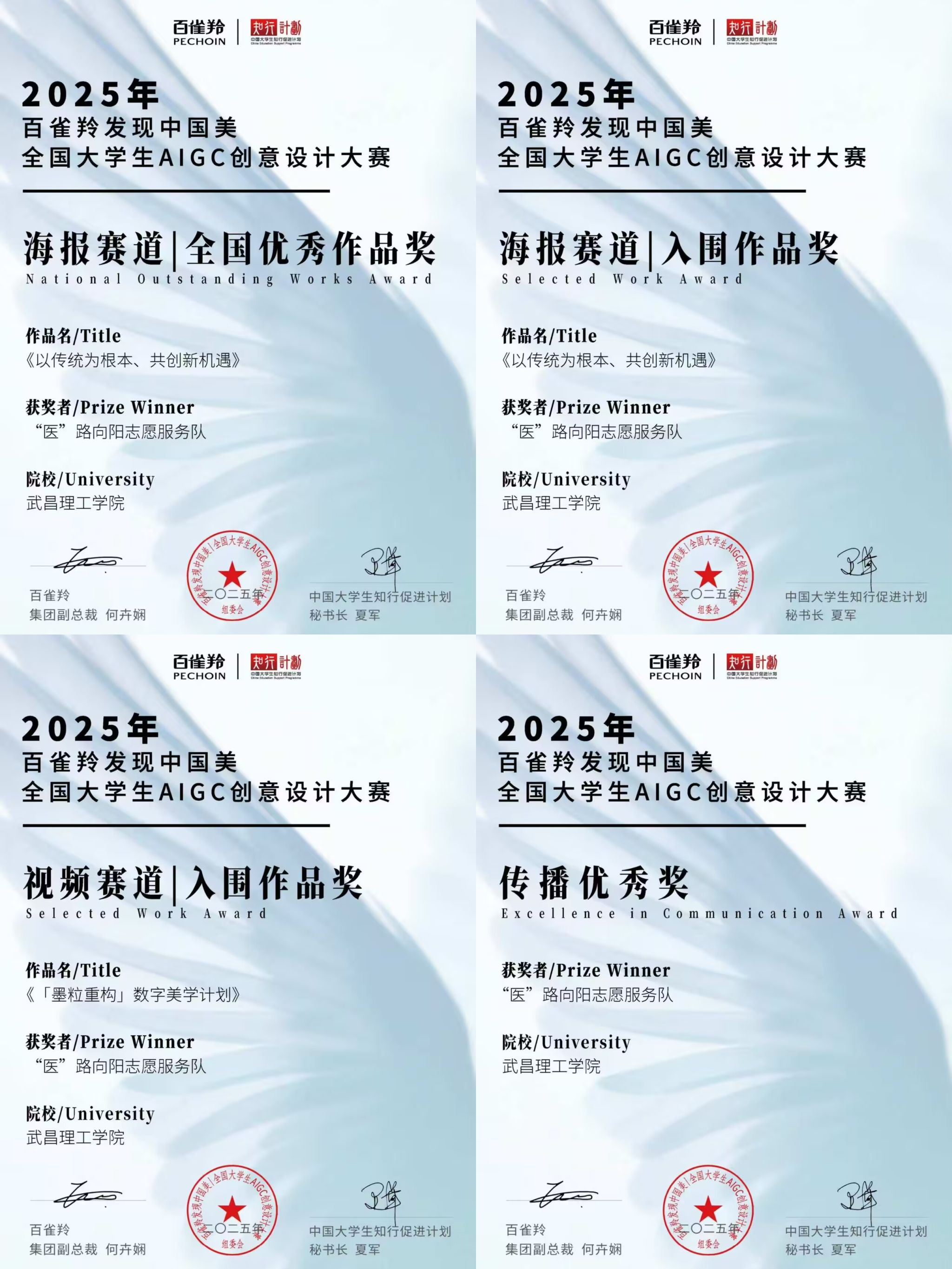 (通讯员 董怡雪 报道)近日,2025年百雀羚“发现中国美”全国大学生AIGC创意设计大赛圆满落幕,2138cc太阳集团“医”路向阳志愿服务队凭借出色的创意设计和扎实的实践成果,在众多参赛队伍中脱颖而出,荣获多项大奖,充分展示了该校学生在创意设计领域的卓越才能和志愿服务精神。