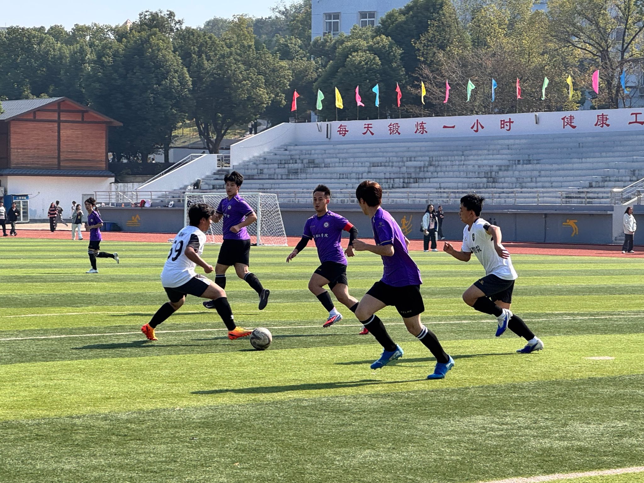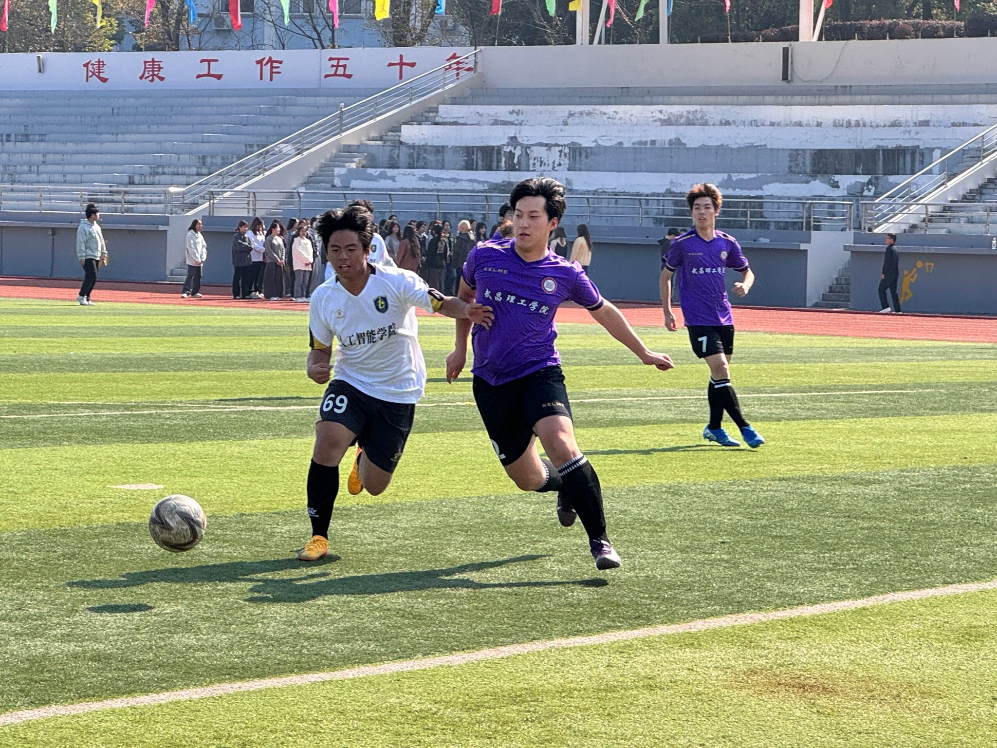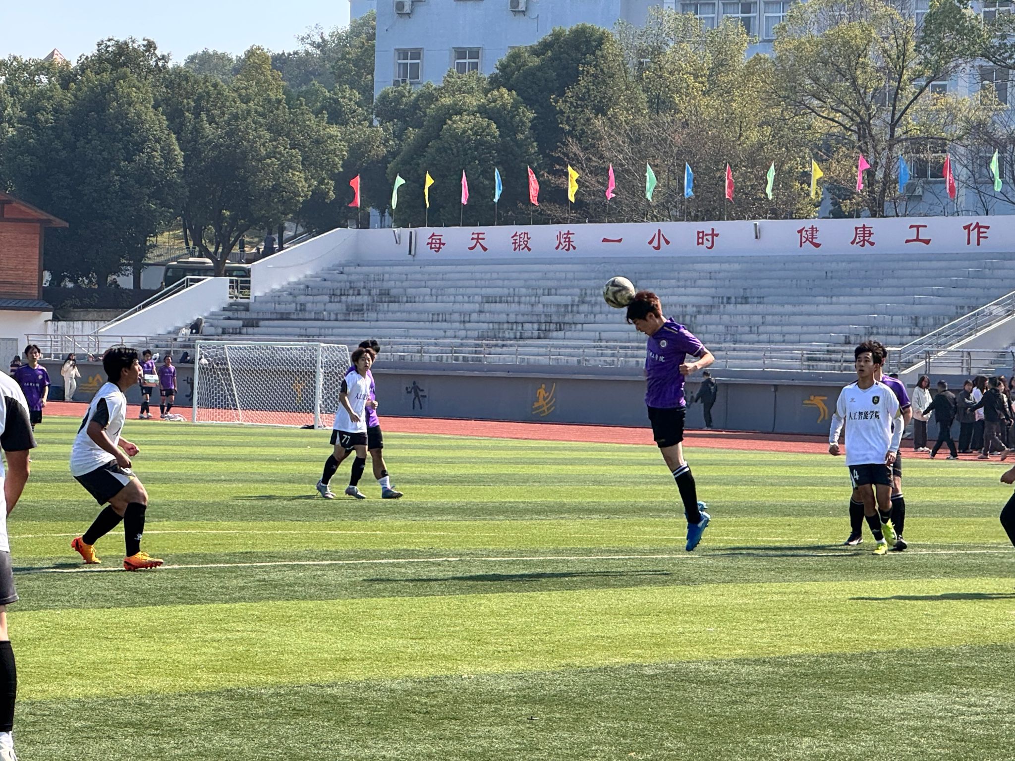 活动现场,学院负责人共同为联队授旗,队员们身着统一队服,以饱满的热情加油鼓劲,双方队员精神饱满,斗志昂扬。绿茵场上,球员们快速奔跑、默契配合,每一次传球、射门都凝聚着团队的智慧与力量。文护生联队凭借细腻的脚法和紧密的配合,多次创造进攻机会,智能学院足球队则以稳健的防守和快速的反击展现出强劲实力。比赛过程紧张激烈,高潮迭起,现场观众的加油助威声此起彼伏。