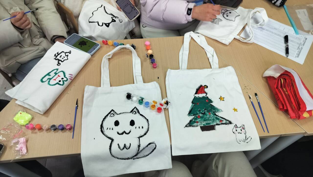 活动现场热闹非凡,秩序井然。工作人员引导同学们有序签到后,大家纷纷来到幸运转盘区一试手气。伴随着转盘的转动,现场欢呼声、惊叹声此起彼伏,粘土套装、串珠材料包、手绘帆布袋等手工物料接连被抽中,惊喜感拉满。拿到物料的同学们移步创作区,化身创意满满的手工达人,专注投入创作。捏粘土的同学指尖翻飞,一个个憨态可掬的小摆件逐渐成型。串珠子的同学细心搭配色彩,编织出精致的挂饰。手绘帆布袋的同学大胆落笔,将奇思妙想化作灵动的图案。创作过程中,同学们相互交流技巧、分享灵感,遇到难题时主动互帮互助,工作人员也全程穿梭在创作区,及时提供指导和协助,现场处处洋溢着轻松愉悦、温馨和谐的氛围。