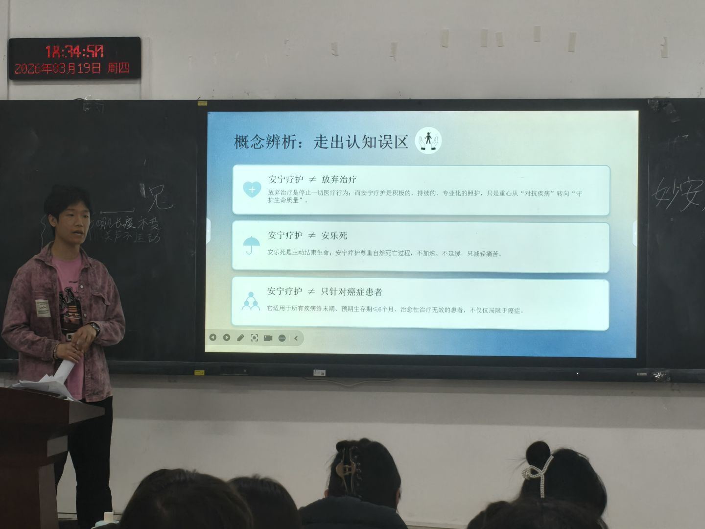 活动现场,参与人员有序签到入场,工作人员核对到场人数,检查话筒、媒体设备等科普物资,再次强调活动传递温暖与专业知识的核心主旨。科普宣讲环节正式拉开帷幕,协会骨干以“什么是安宁疗护”为切入点,系统阐释了安宁疗护的核心定义、服务对象与核心目标,明确其并非放弃治疗,而是为临终患者及家属提供全方位的身心支持;围绕“安宁疗护能做什么”,详细拆解了疼痛管理、症状控制、心理疏导、灵性关怀、家属支持五大核心服务内容,结合临床真实案例,讲解了癌痛规范化用药、非药物镇痛、临终患者情绪安抚、家属哀伤辅导等实用技巧。针对“如何面对临终阶段”,分享了与临终患者沟通的原则与方法,强调尊重患者意愿、维护生命尊严的重要性,让在场同学对安宁疗护的专业内涵与人文价值有了更深刻的认知。