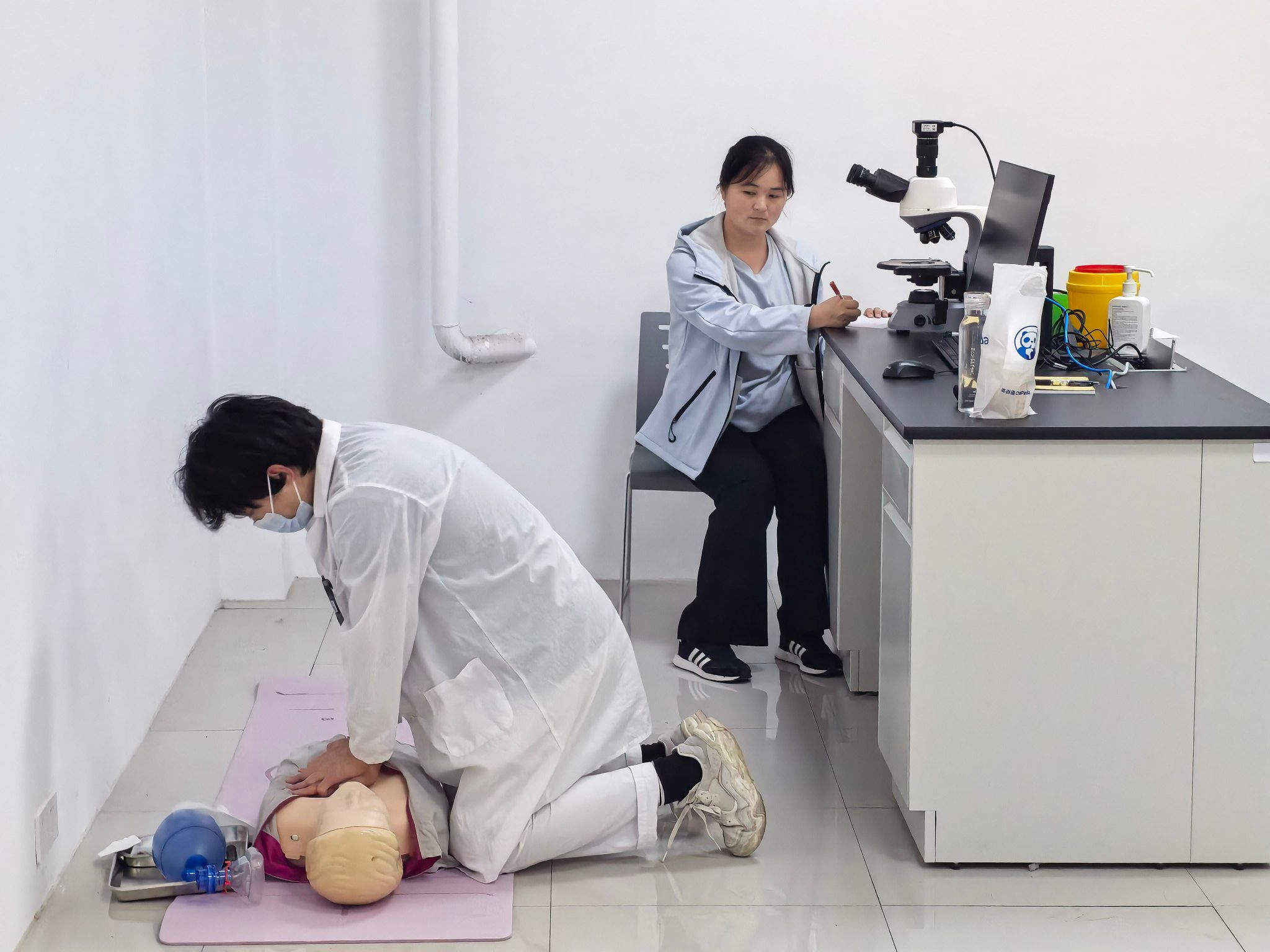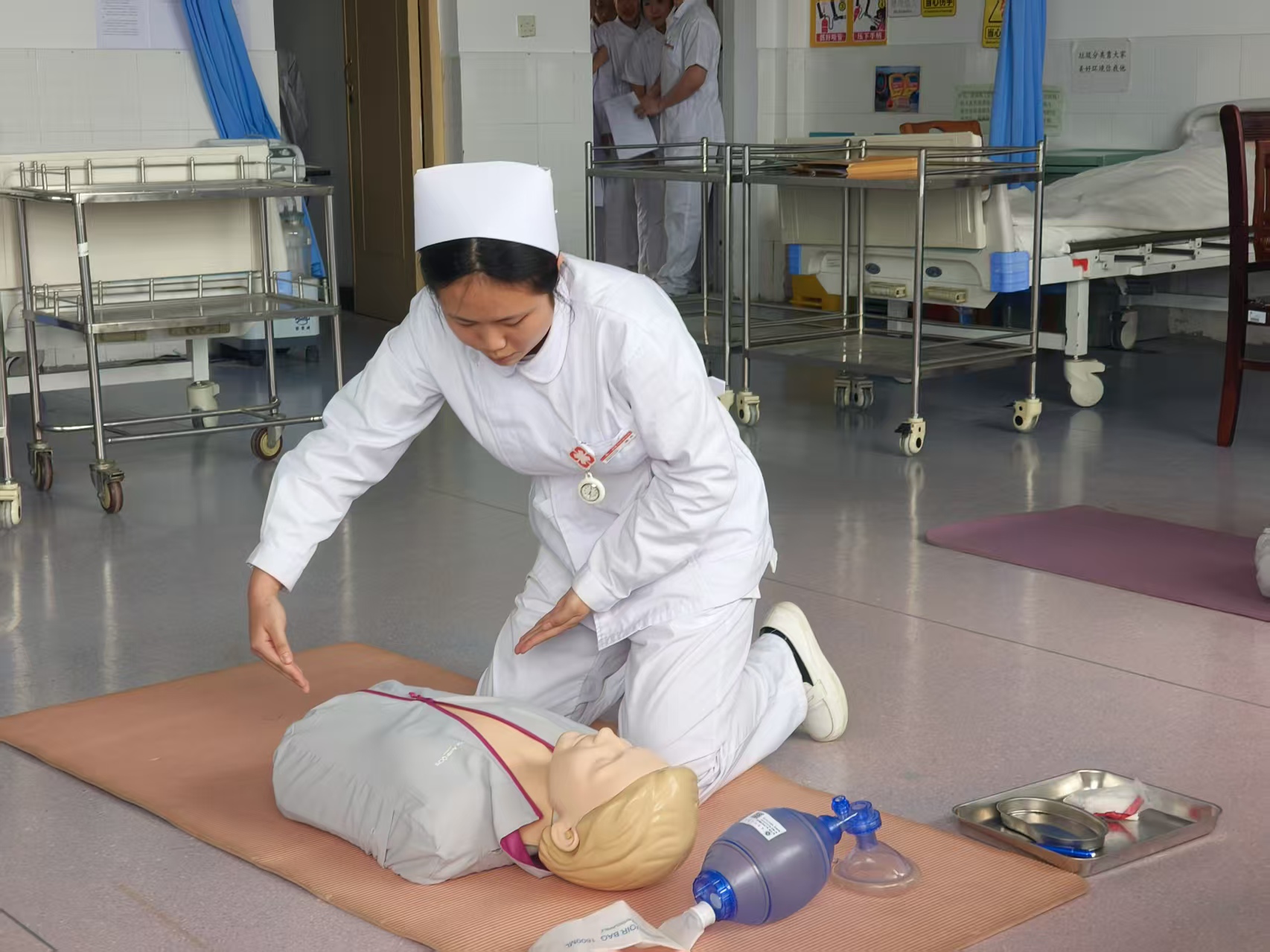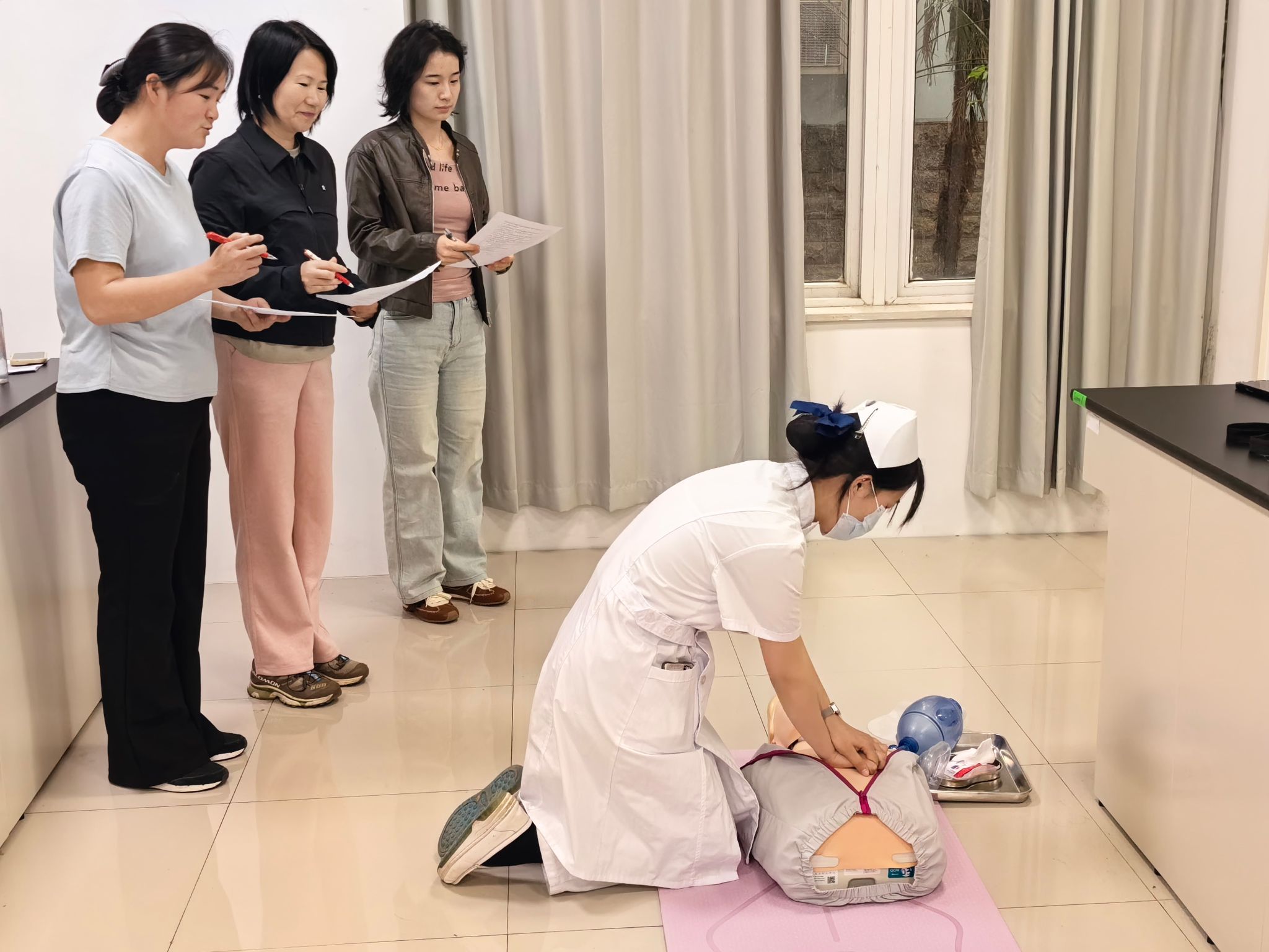 比赛设护理107、108、205、513四个考场,每个考场配备6-7个考位,确保赛事有序高效进行。参赛选手身着整洁护士服,提前10分钟到考场外候考,按流程填写评分表、准备操作物品,全程严谨规范。实操考核现场,紧张而有序。在CPR操作环节,选手们沉着冷静、流程规范,从环境判断、意识呼叫、胸外按压到人工呼吸,每一个动作都力求标准到位。胸外按压时,他们定位精准、力度适中、频率规范,保证按压深度与回弹效果,人工呼吸时,操作规范、注意气道开放,充分展现出扎实的理论功底与熟练的动手能力。面对模拟急救场景,同学们神情专注、反应迅速,既注重操作的规范性,又体现出对“生命至上”的敬畏之心,将专业知识与临床思维紧密结合。评委老师们围绕操作流程、动作标准、急救意识、人文关怀等多个维度逐一细致评分,并在赛后及时给予针对性点评与指导,帮助同学们查漏补缺、提升技能。