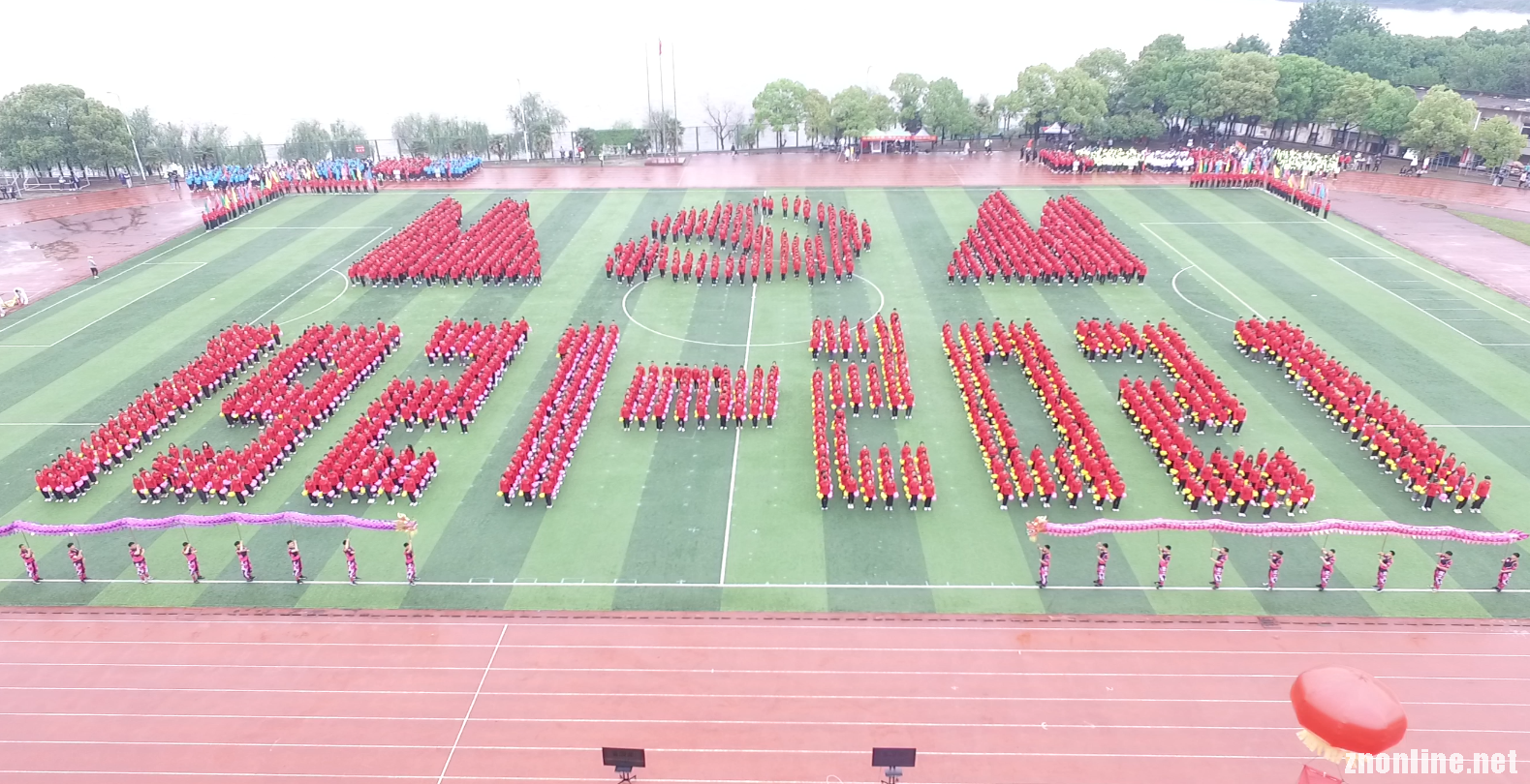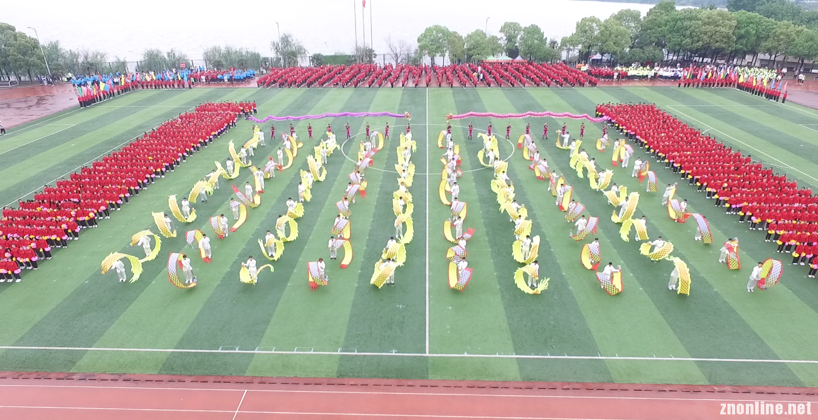 表演中,近2000名师生不断变换阵型,形成“1921-2021”“不忘初心”“党旗党徽”“爱心”“中国”“五角星”等不同的图案。该校还出动规模庞大的舞龙队,100条龙在运动场穿梭,视觉震撼,寓意“龙腾盛世”。表演在近万人齐声合唱“没有共产党就没有新中国”的歌声中落下帷幕。