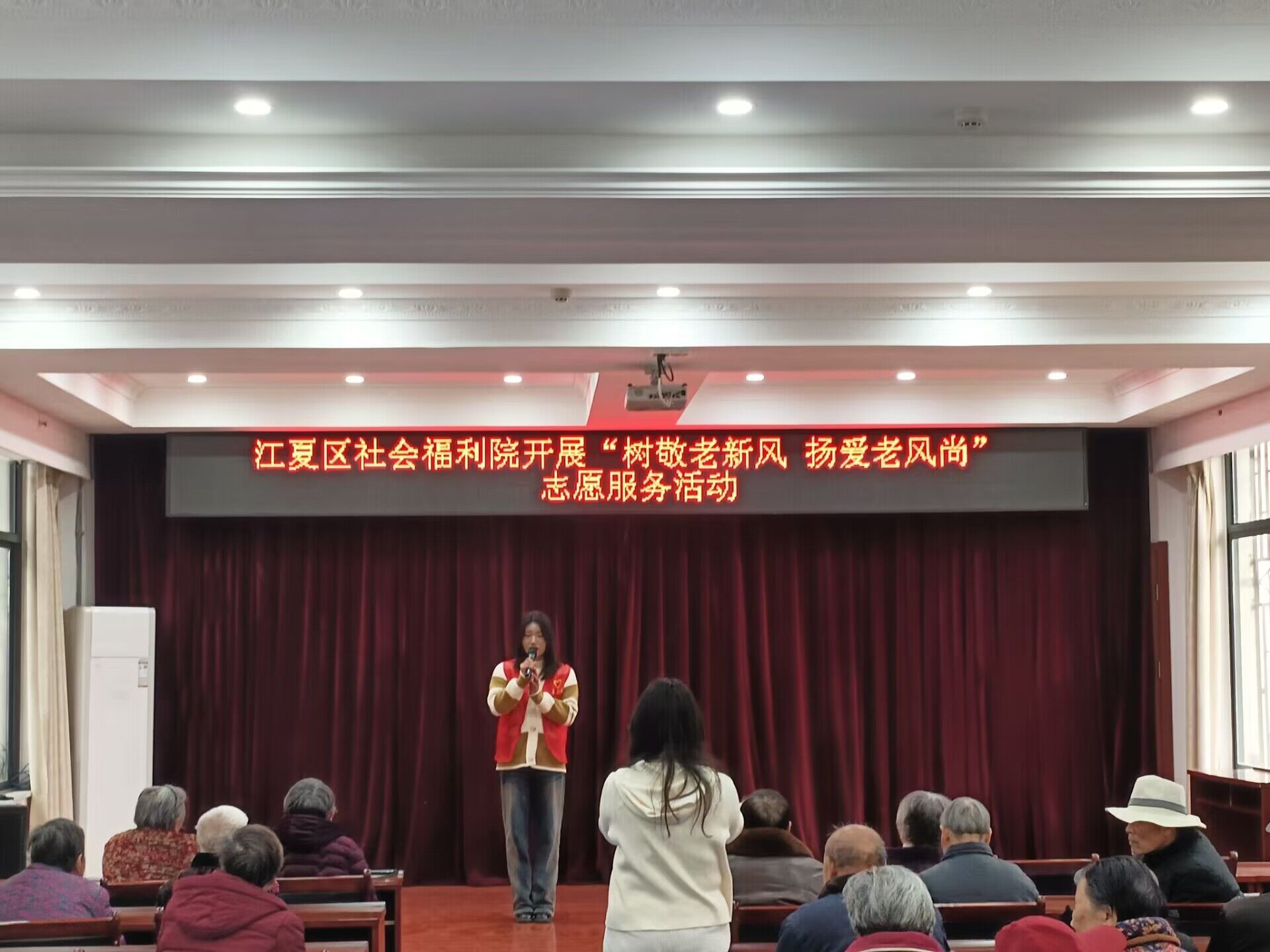 活动前期志愿者们排练表演节目,学习折纸花,希望在活动中给老人们带来开心。活动当天下午14:00志愿者们到达福利院门口后,为防止将最近流行的流感传染给老人们,做了抗原检测并带上口罩;随后志愿者们在福利院工作人员带领下前往食堂二楼活动中心进行演出彩排,并为老人们准备了水果。志愿者们将活动现场的桌子、椅子仔细擦拭,随着老人们陆续到来,志愿者们依次搀扶老人们入座到对应位置,并热情地与老人们聊天,送水果,询问他们的身体健康情况、生活环境以及日常休闲运动等。这不仅让老人们感到自己被关注和重视,也让他们有机会倾诉自己的感受和需求;之后志愿者们为老人们带来精彩的表演,并教老人们学习了“感恩的心”手势舞的其中一段,邀请老人上台表演;随后志愿者们一对一教老人们用皱纹纸折玫瑰花,一派温馨和谐的景象;最后志愿者和老人们手持纸艺玫瑰花合照,福利院负责人带领志愿者们参观了福利院的整体环境,并希望达成长期合作。