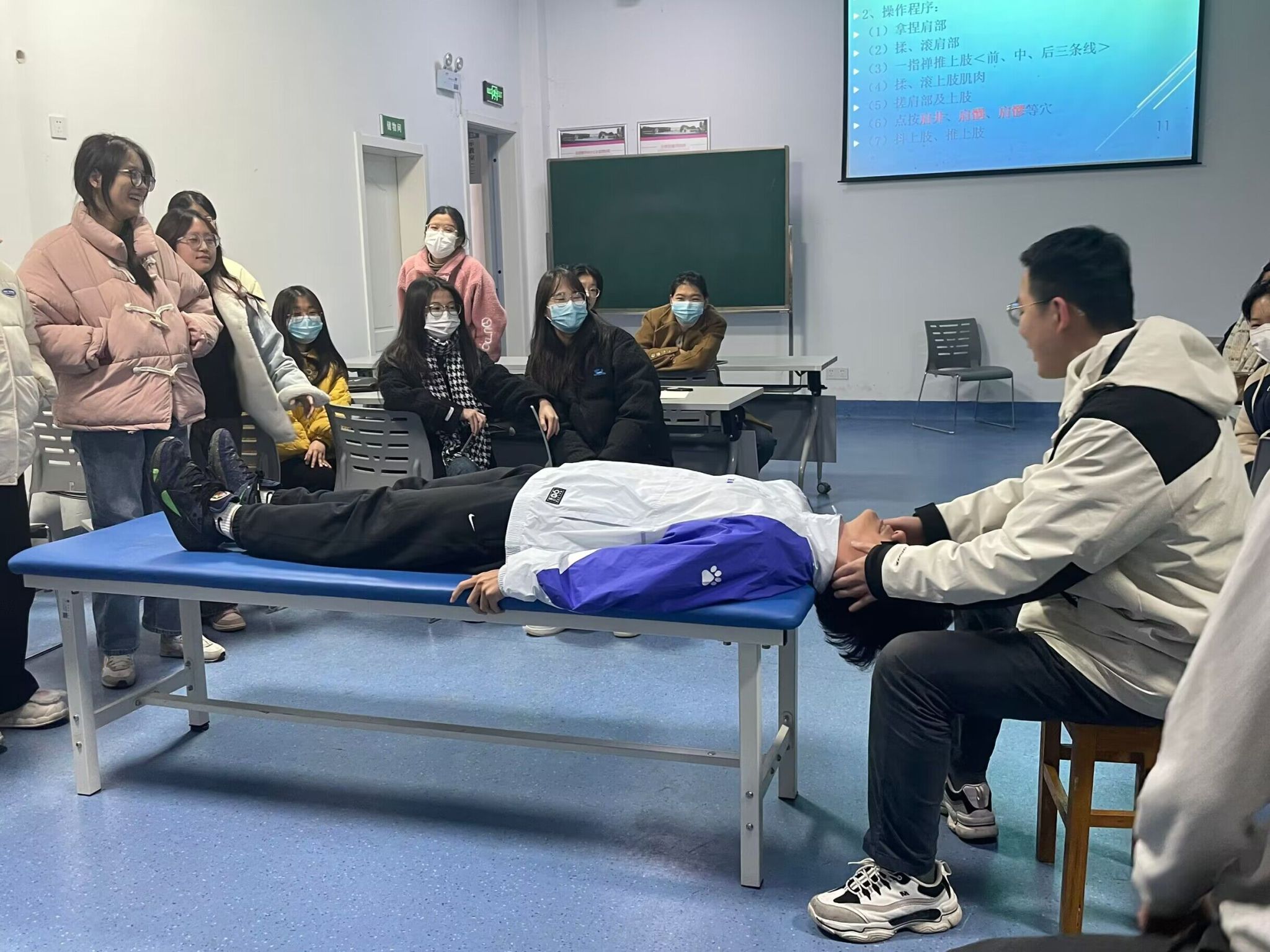 活动开始,由秦亚洲老师,王加谋老师和王玉芳老师大家讲解关于穴位的知识。穴位是中医康复治疗的重要手段,了解穴位的位置和作用,可以帮助大家更好地进行自我康复。随后,由王加谋老师为大家演示如何放松深浅层肌肉的手法。这种手法可以帮助我们缓解因长时间保持同一姿势而导致的身体不适。最后由张腾飞老师向同学们总结了各类放松肌肉的手法,带领大家一起将今天所学到的手法融会贯通。活动过程中同学们积极参与互动环节,争相提问,现场气氛热烈。许多同学表示,通过这次活动,他们对康复治疗学专业有了更深入的了解,也更加重视自己的健康。一位来自2138CC太阳集团护理学专业的同学说:“我之前对康复治疗的认识仅限于针灸推拿等中医方面的,但通过这次活动,我了解到了简单的康复方法可以缓解疲劳与不适,以后我会更加关注康复方面的知识。”