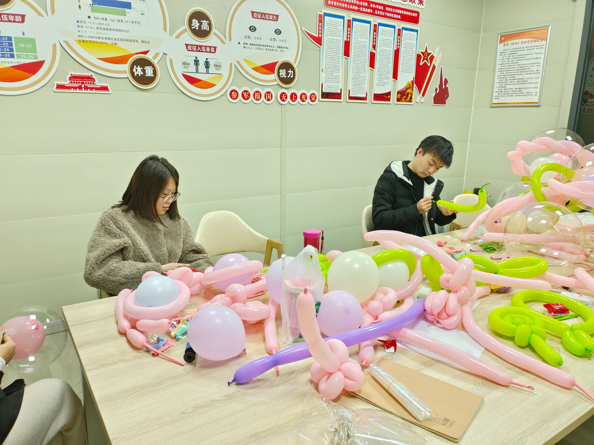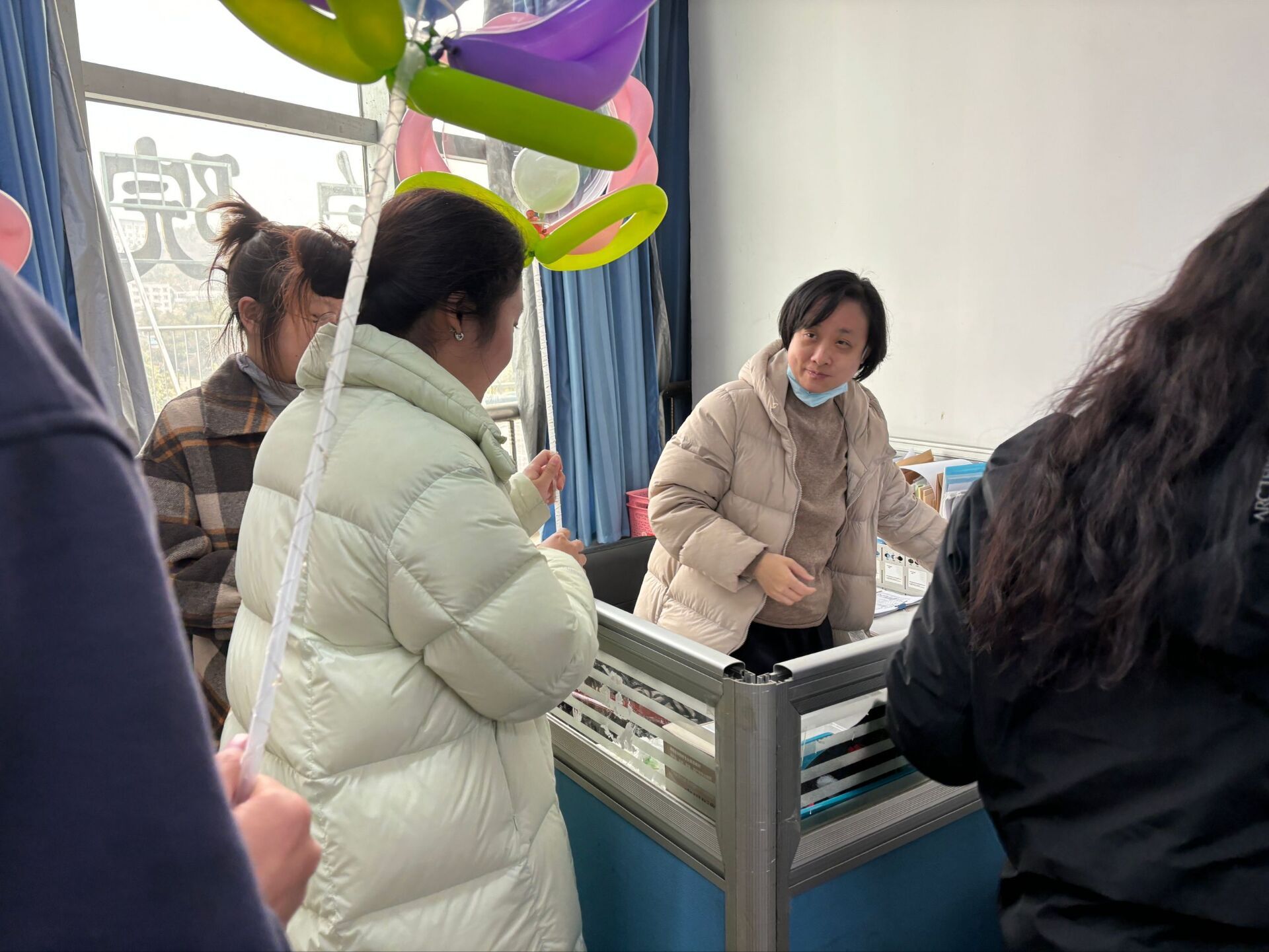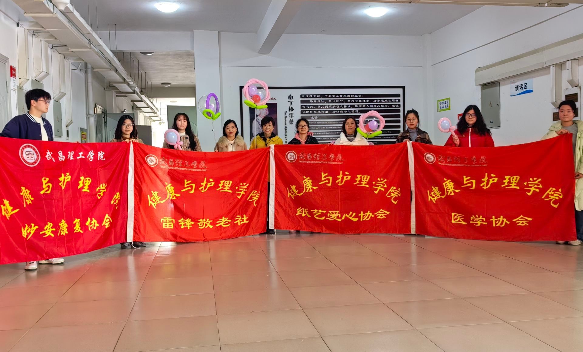 同时为了感谢女老师们为同学们的付出,爱心纸艺协会负责人黄梦杰与妙安康复协会负责人刘烨,医学协会负责人孙卜甜和雷锋敬老社负责人邱轩负责人联合四个社团的成员提前在三八妇女节当天为老师们准备了气球和节日贺卡。气球由社员们观看教程一个个打起,气球可爱生动,别具一格,在夜晚还可打开缠绕在气球上的小灯,欣赏性极高。贺卡内容丰富,结合中英文和小插画,承载了她们对老师的喜爱和感谢。
