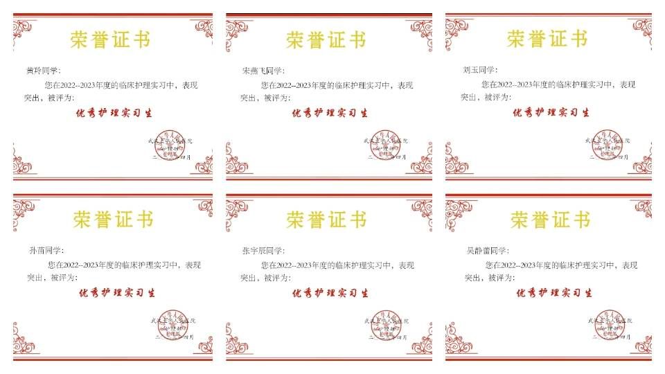 起初刚进临床实习的时候,她们很胆怯,生怕做错一个步骤,以至于不敢进行实际的临床操作,经过一段时间的实习后,在各科室带教老师的鼓励下,她们能够熟练独立的完成各项操作,可是在这熟练的背后,是她们的艰辛付出,是每次下班后自觉的加练。就拿静脉穿刺这个简单的操作来说,刚进入临床实习期间她们的穿刺操作总是不理想,在给病人打针时甚至受到病人的刁难,他们也曾流下委屈的泪水。在经过大量重复练习后,她们的静脉穿刺的水平已经达到了一针见血的水平,再加上她们细心周到的服务态度,病人特别喜欢她们。2022年是一个特殊的年份,在实习的十个月期间,她们经历了新冠疫情,她们积极参加疫情防控工作,体现了一个医务工作者应有的社会责任和担当,最终得到了武汉大学人民医院各科室带教老师的认可,并且获得“优秀护理实习生”的荣誉称号,之后又顺利通过武汉大学人民医院的录用考核、顺利签订三方协议。